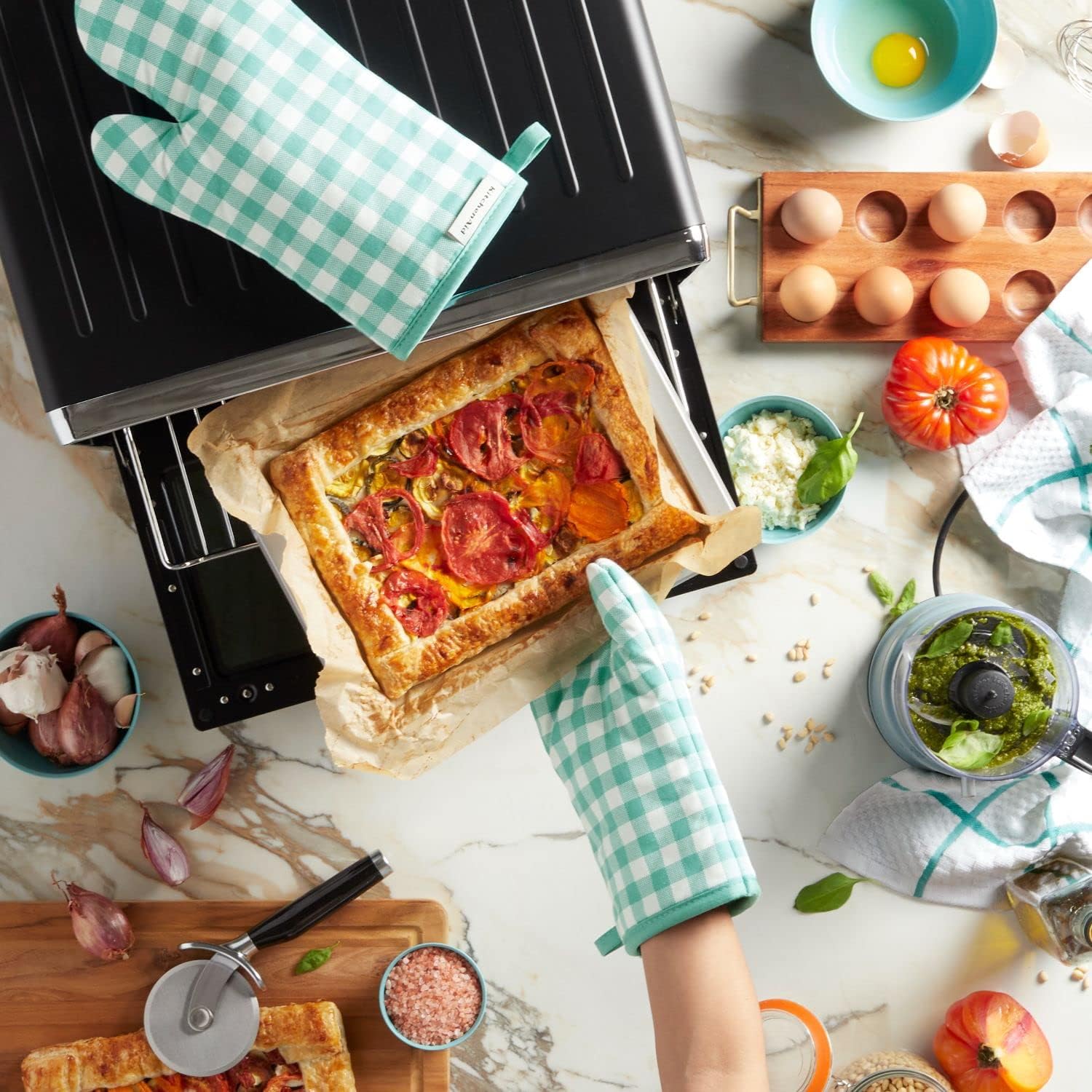 KitchenAid Gingham Oven Mitt 2-Pack Set, Aqua Sky, 7"x13"
