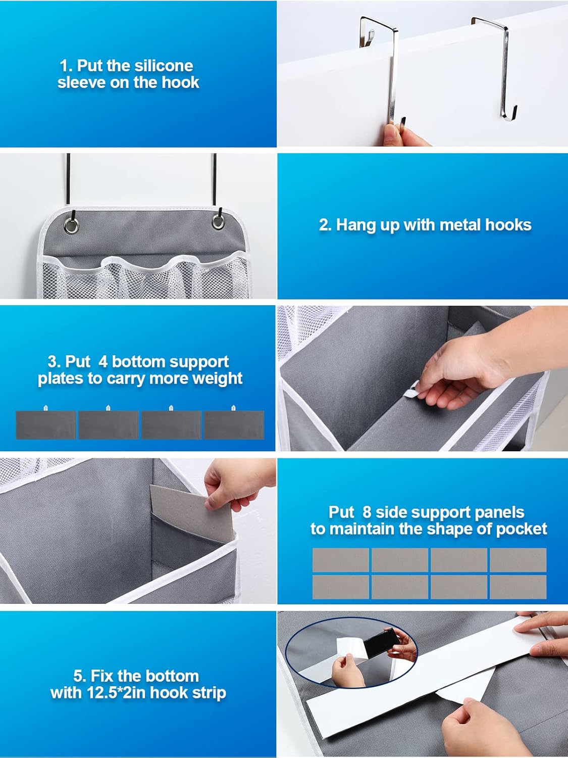 - Strong Construction & No Tilting Design - This hanging organizer is made of high quality non-woven fabric, which is breathable, solid and durable. 5 large pockets are reinforce with 2mm thick cardboard and fiberglas, and the enclosed sides joined together with the large pockets, plus with swing-proof hook & loop strips, making this dorm room essentials hold its shape and security, and ensures no moving/swaying even when you open or close the door