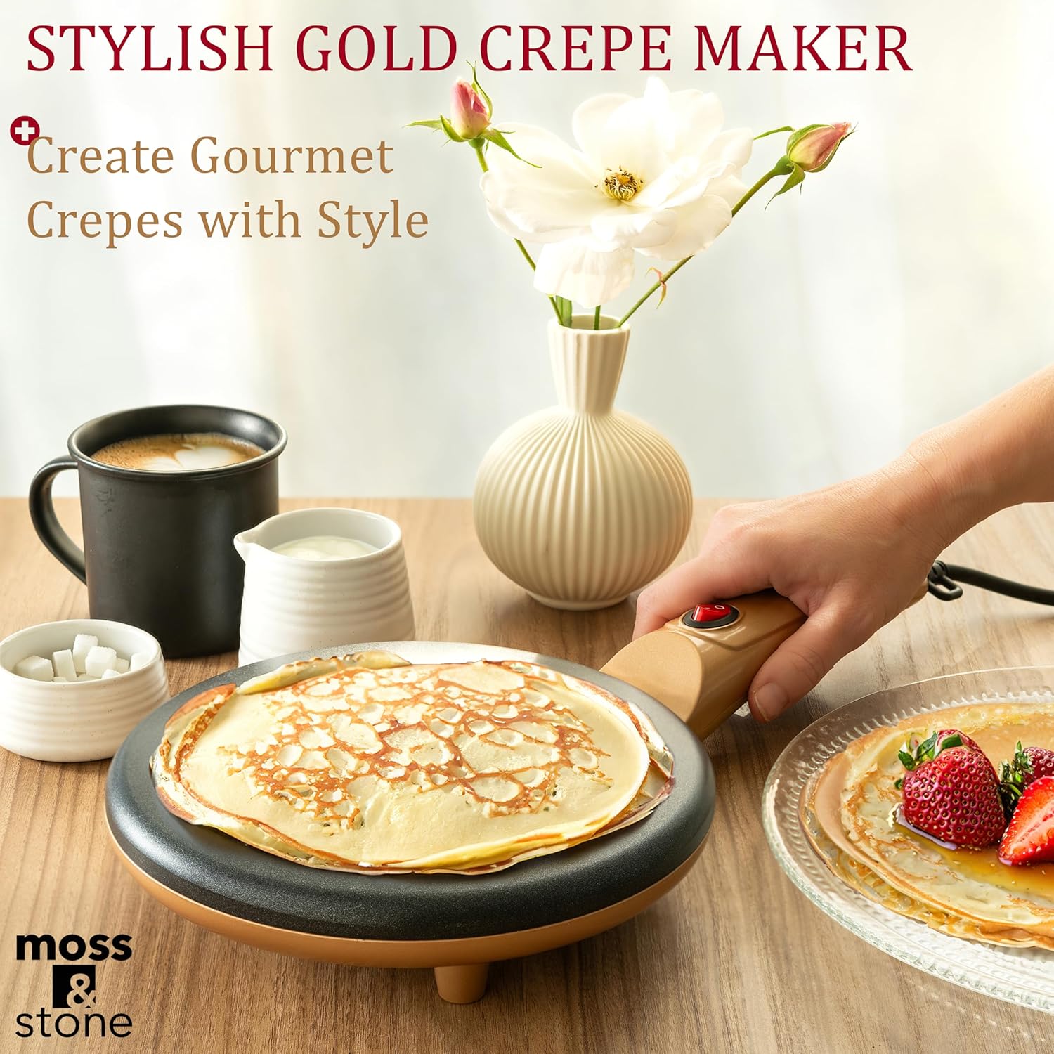 Moss & Stone Gold Electric Crepe Maker 8 Inch, Portable Crepe Maker & Hot Plate Cooktop On/Off Switch, Nonstick Coating, Automatic Temperature Control, Easy To Use For Pancakes, Blintz