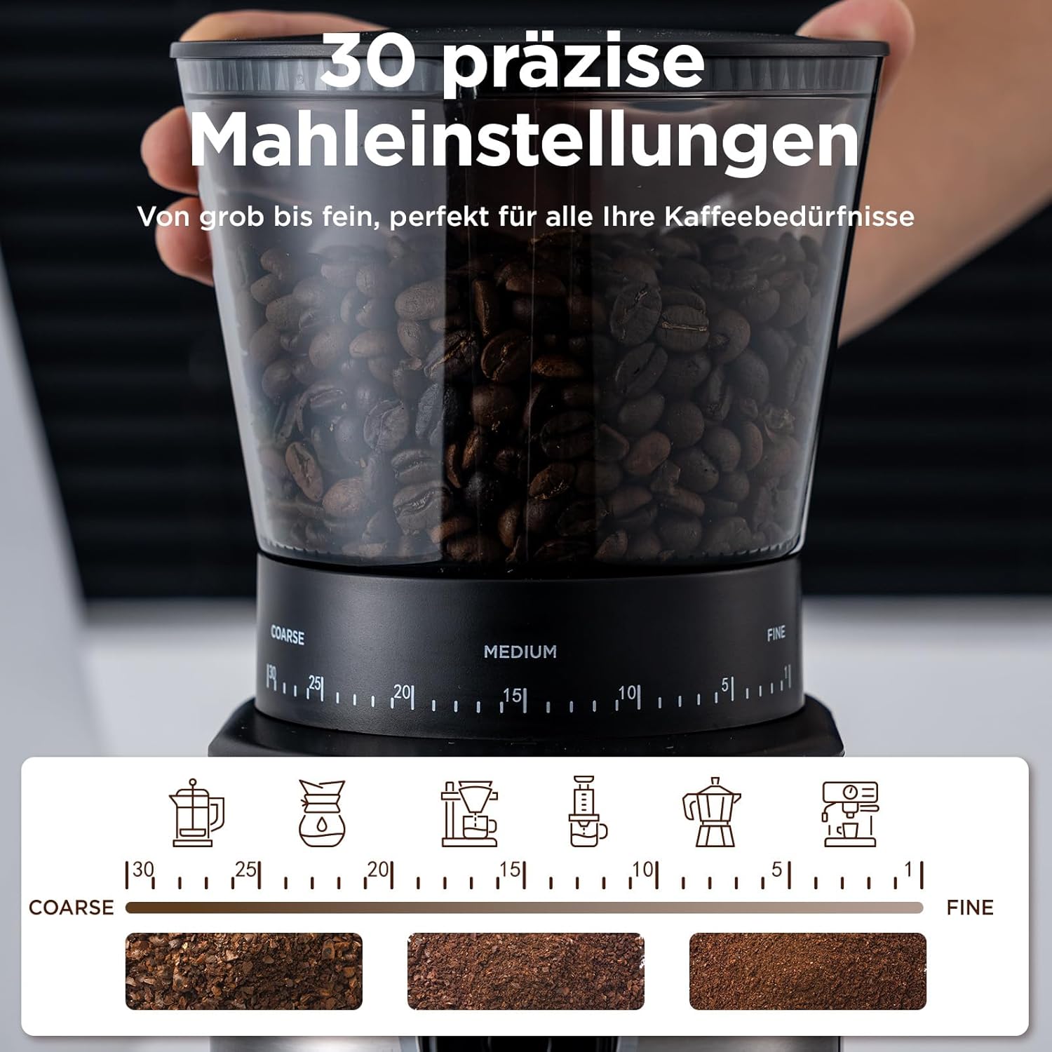 - 【Precise Grinding Settings】The OLLYGRIN burr coffee grinder offers 30 precise grind settings to make everything from an ultra-fine grind for espresso to a coarser grind for french press coffee for your customized brewing method.