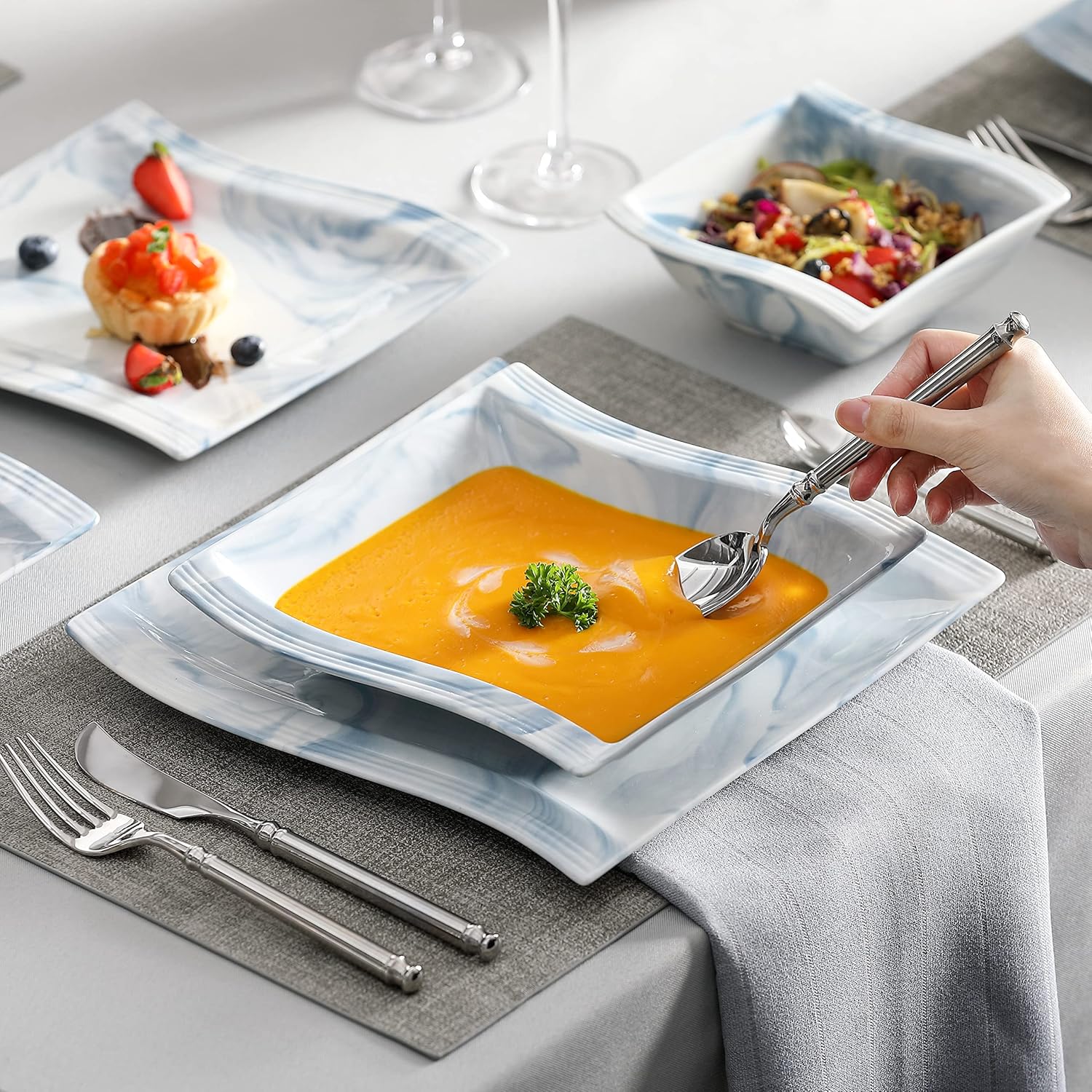 - Stylish and Low Maintenance -- Featured with low-profile wavy-shaped square design, each plates and bowls set are distinct and add an sophisticated touch to any table setting; The blue dinnerware set are designed to provide the best dining experience while requesting low maintenance, saves you time and effort in upkeep
