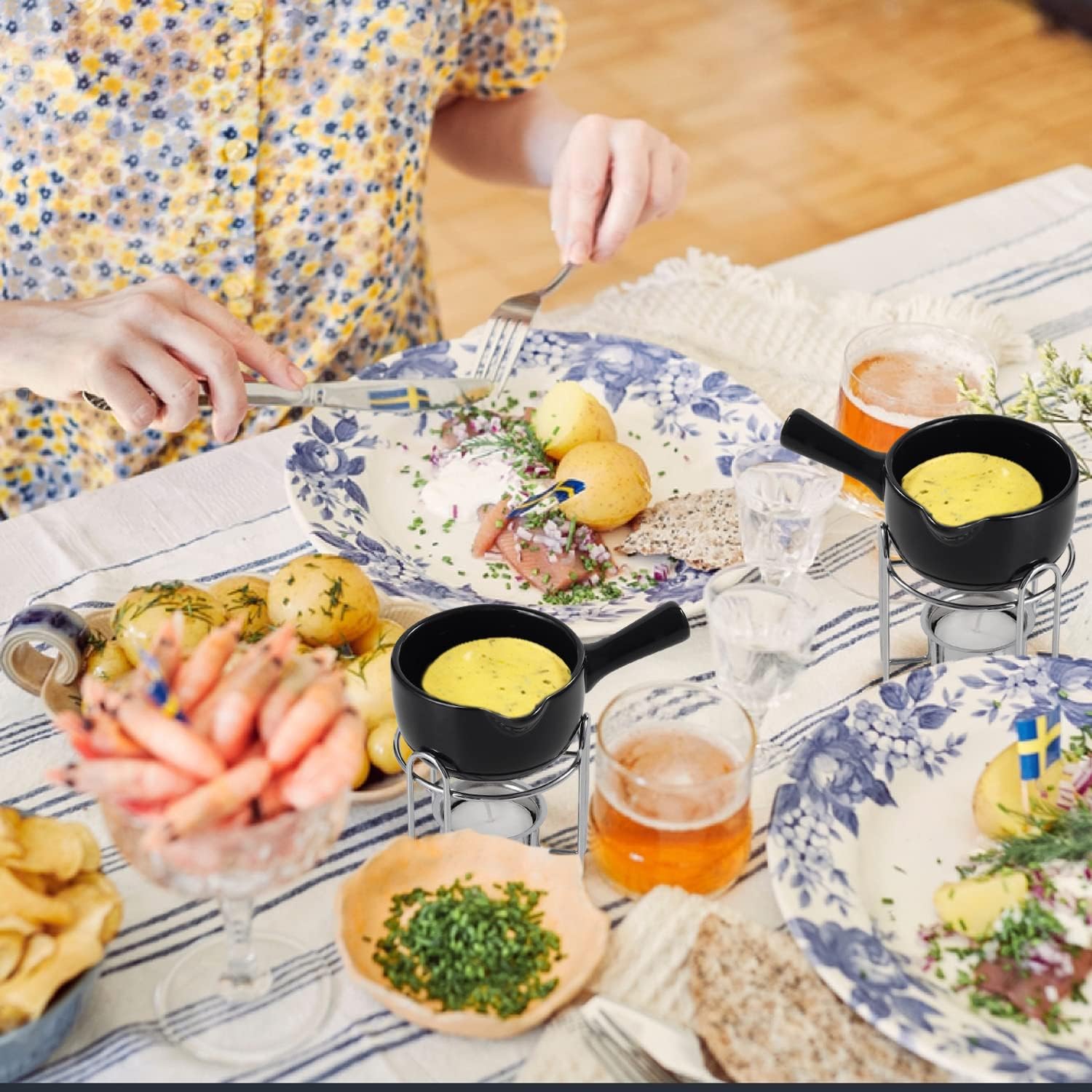 - COMPLETE BUTTER WARMER SET - Our butter warmer pot set includes 4 pieces of ceramic butter warmers, 4 metal brackets, and 4 tea light candles. It is designed for convenient storage by stacking or utilizing the original packaging. These crab butter warmers are both charming, practical, and easy to clean. Unlike plastics, ceramics is an elegant, environmentally friendly, and versatile material that eliminates concerns about harmful toxins leaching into your food. The ramekin bowls are oven-safe, dishwasher-safe, microwave-safe, and freezer-safe