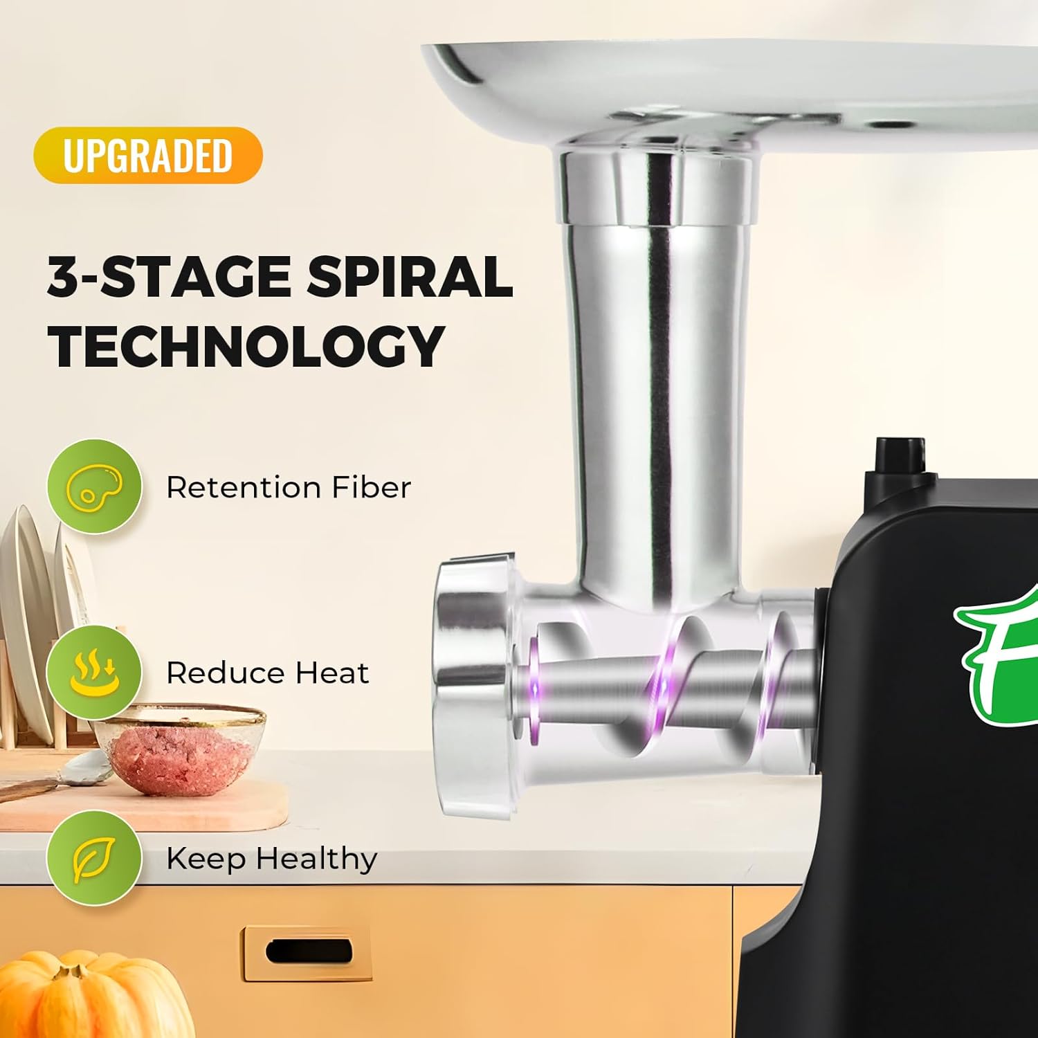 - 3-Stage Spiral Technology: The electric meat grinder machine adopts 3-Stage Extrusion Design, which can reduce the heat generated by the meat grinder, and better maintain the flavor and health without destroying the fiber of meat