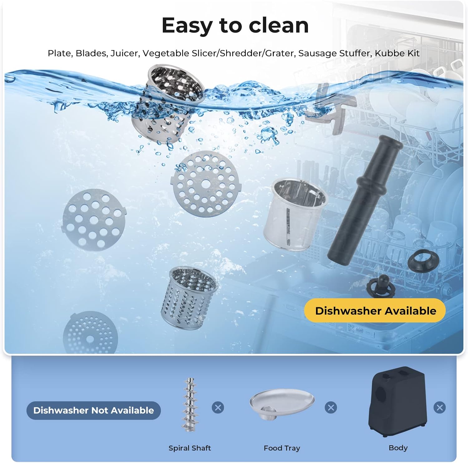 - Easy to Use & Clean: You could turn on the mince meat machine with only 1 button and start to grind meat. Also, all accessories can be removed separately for cleaning. Stainless steel blade and plates are dishwasher safe