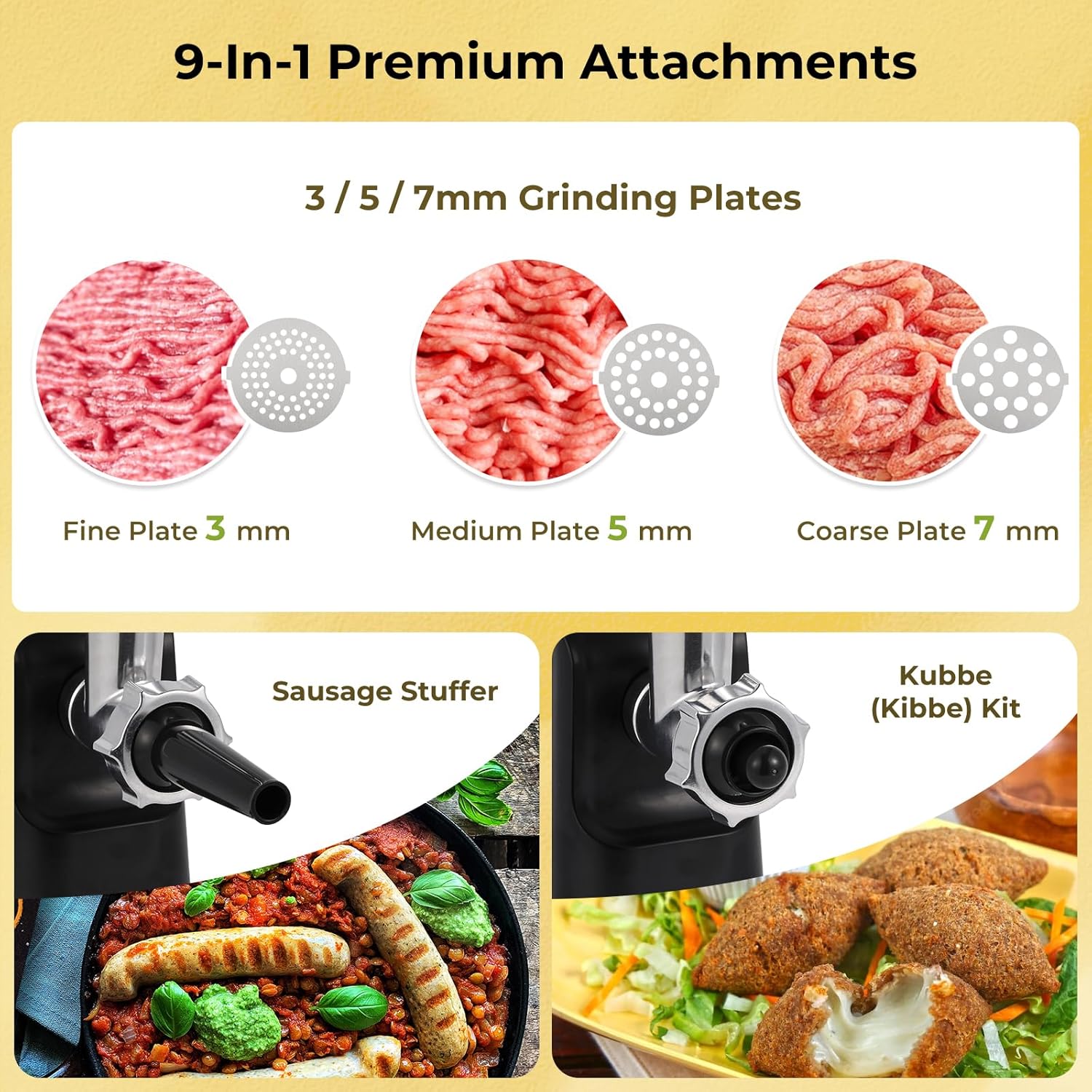 - Food-Grade Attachments: The electric meat grinder offers all the functions you need, including 3 grinding plates, 1 sausage stuffer, 1 juicer, 1 kubbe kit, and individual attachment for vegetable slicing, shredding, and grating, along with a food pusher