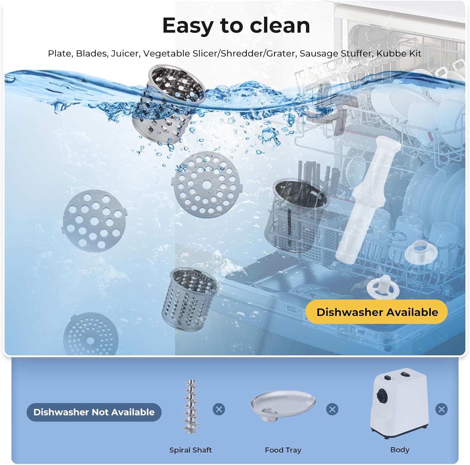 - Easy to Use & Clean: You could turn on the mince meat machine with only 1 button and start to grind meat. Also, all accessories can be removed separately for cleaning. Stainless steel blade and plates are dishwasher safe