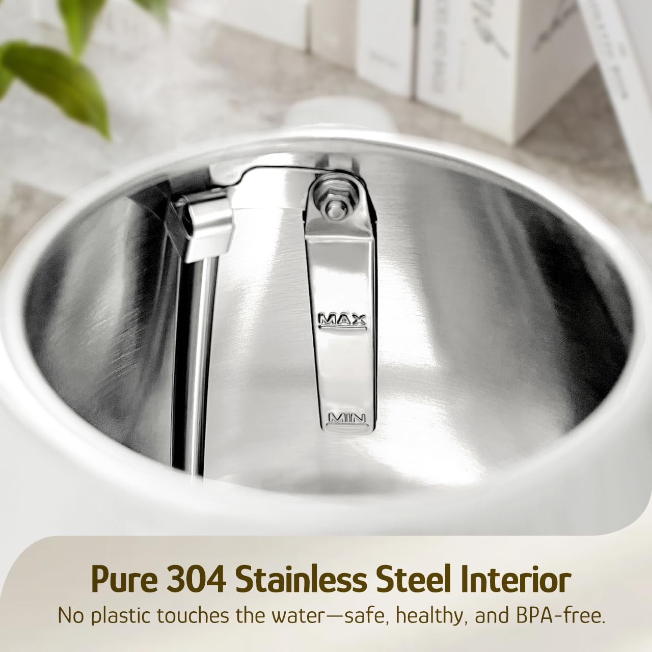 - All Stainless Steel - This retro electric kettle is crafted with food-grade 304 stainless steel in its interior, lid, and filter. It has no plastic in contact with the water, providing you and your family with BPA-free healthy drinking.