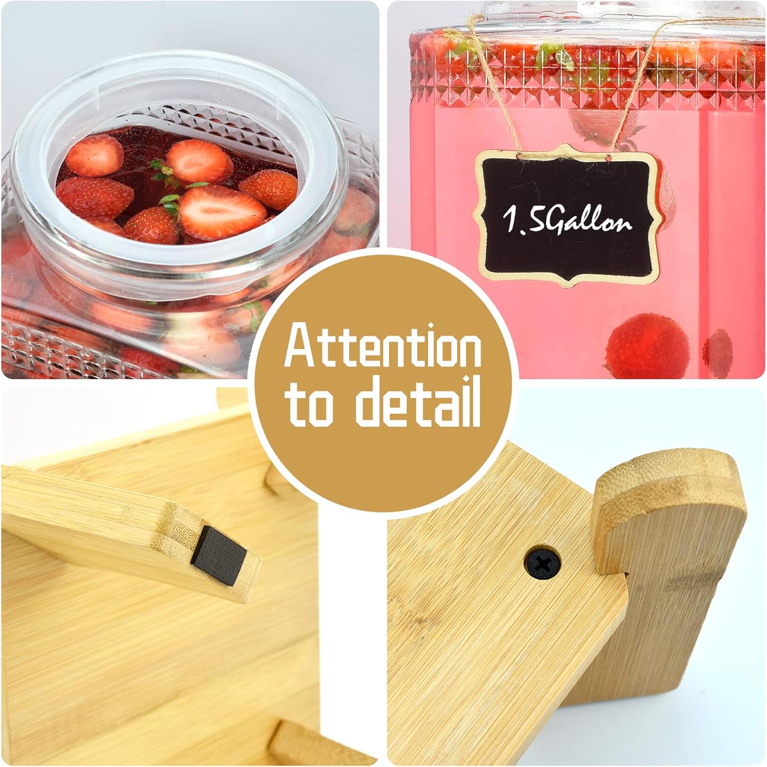 1.5 Gallon Glass Beverage Dispenser With Stand(Natual Bamboo). Water Drink Dispensers for Parties With Stainless Steel Spigot 100% Leakproof.Perfect For Parties And Daily Use.