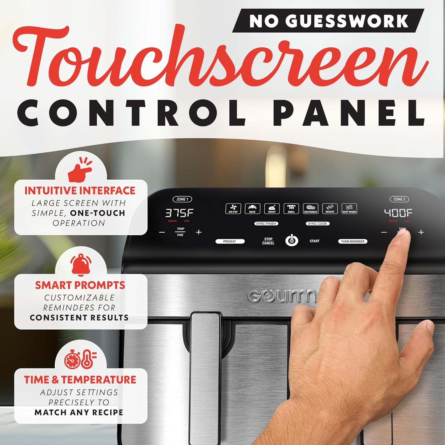 Gourmia Dual Basket Digital Air Fryer – 10 QT, FryForce 360° Technology, 7 Presets, Match Cook & Smart Finish, PTOA-Free Baskets & Crisper Trays, 1600W, Black