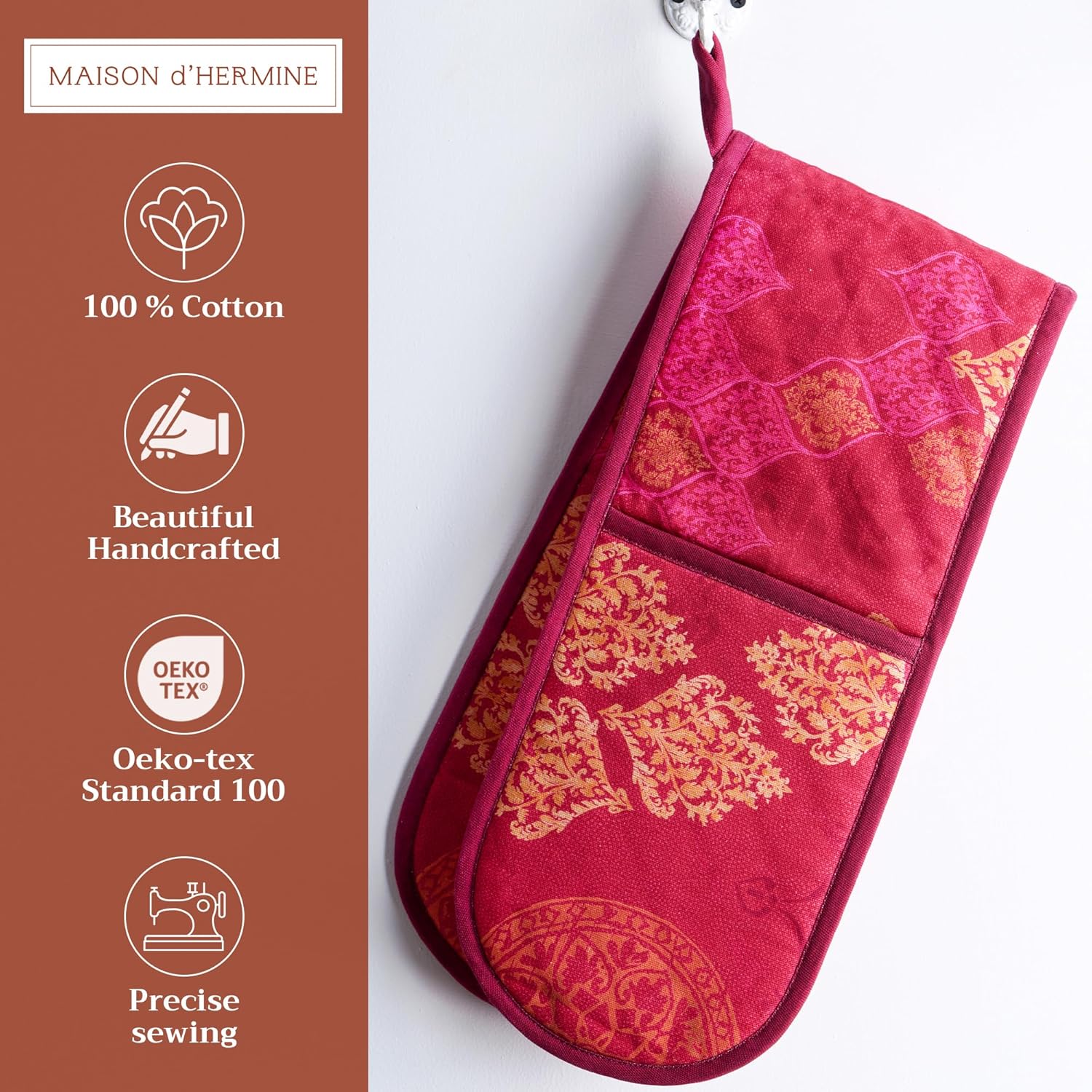 - Package includes: Includes 1 double oven mitt sized 7"x35". Perfect for handling hot cookware safely while adding a touch of European elegance to your kitchen. Designed in Europe and made in India with care