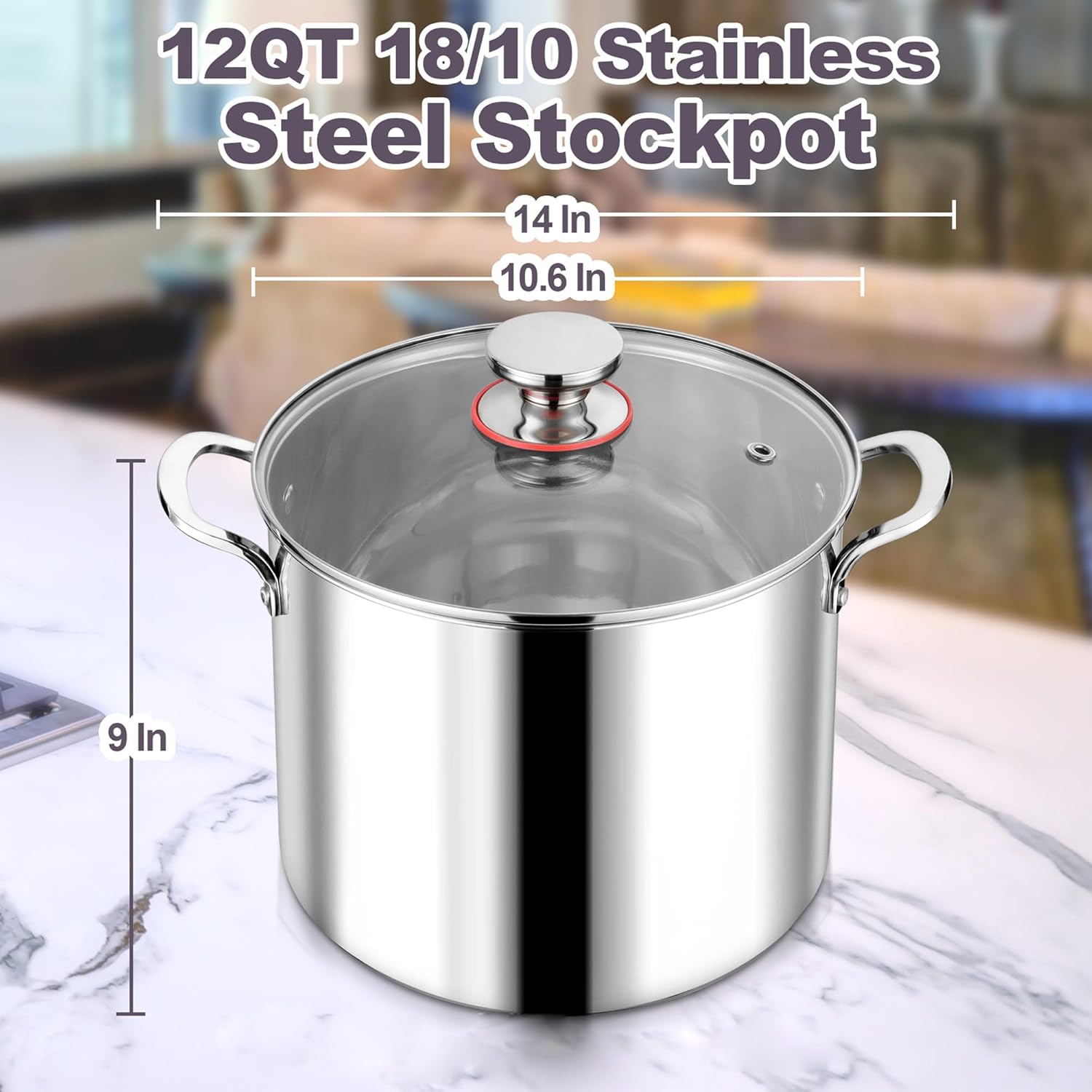- Premium& Healthy Material, 12 quart soup stock pot is made of high quality 18/10 food grade stainless steel, it canβt chemically react to any food at high temperatures, which is non-toxic, non-allergic & safe for cooking, heavy grade stainless steel stockpot with glass lid, anti rust and warp resistant, more durable and sturdier