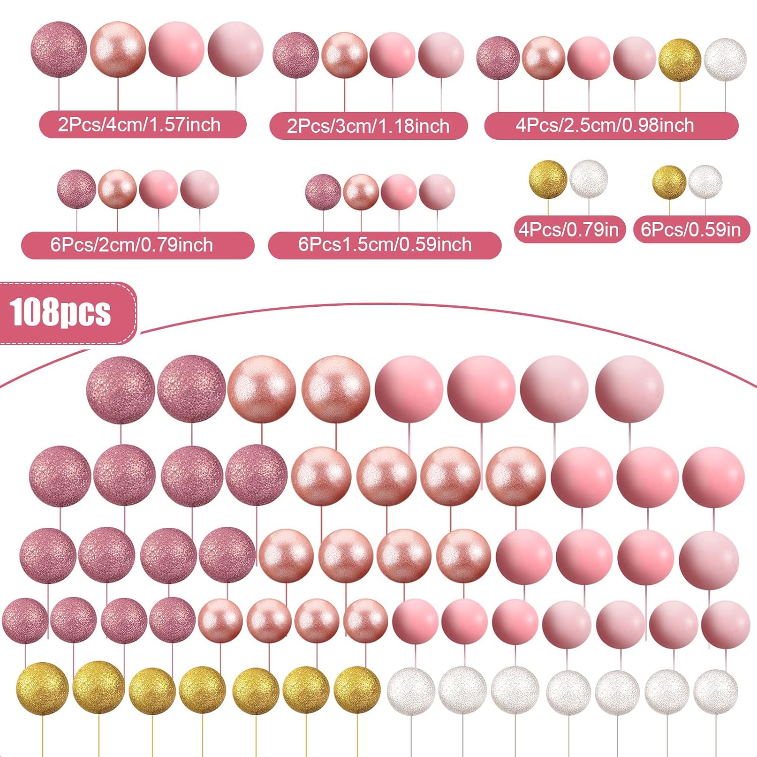 108 Pcs Balls Cake Topper DIY Cupcake Insert Foam Balloons for Cake Baking Wedding Anniversary Birthday Decoration(Assorted Pink, White, Gold,Multi Sizes)