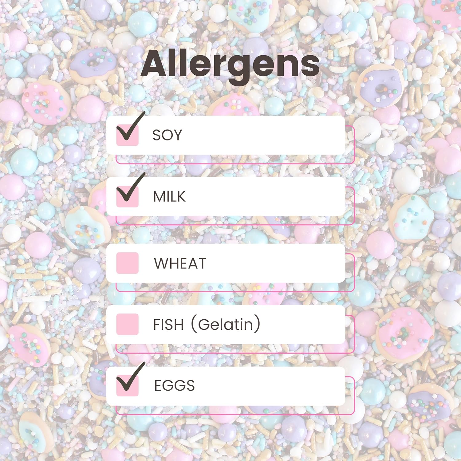 - Allergen & Safety Notice: Made in a facility that processes wheat, eggs, milk, soy, and tree nuts. Some blends contain hard sugar pearls and dragee rods, which may pose a choking hazard for children under 1