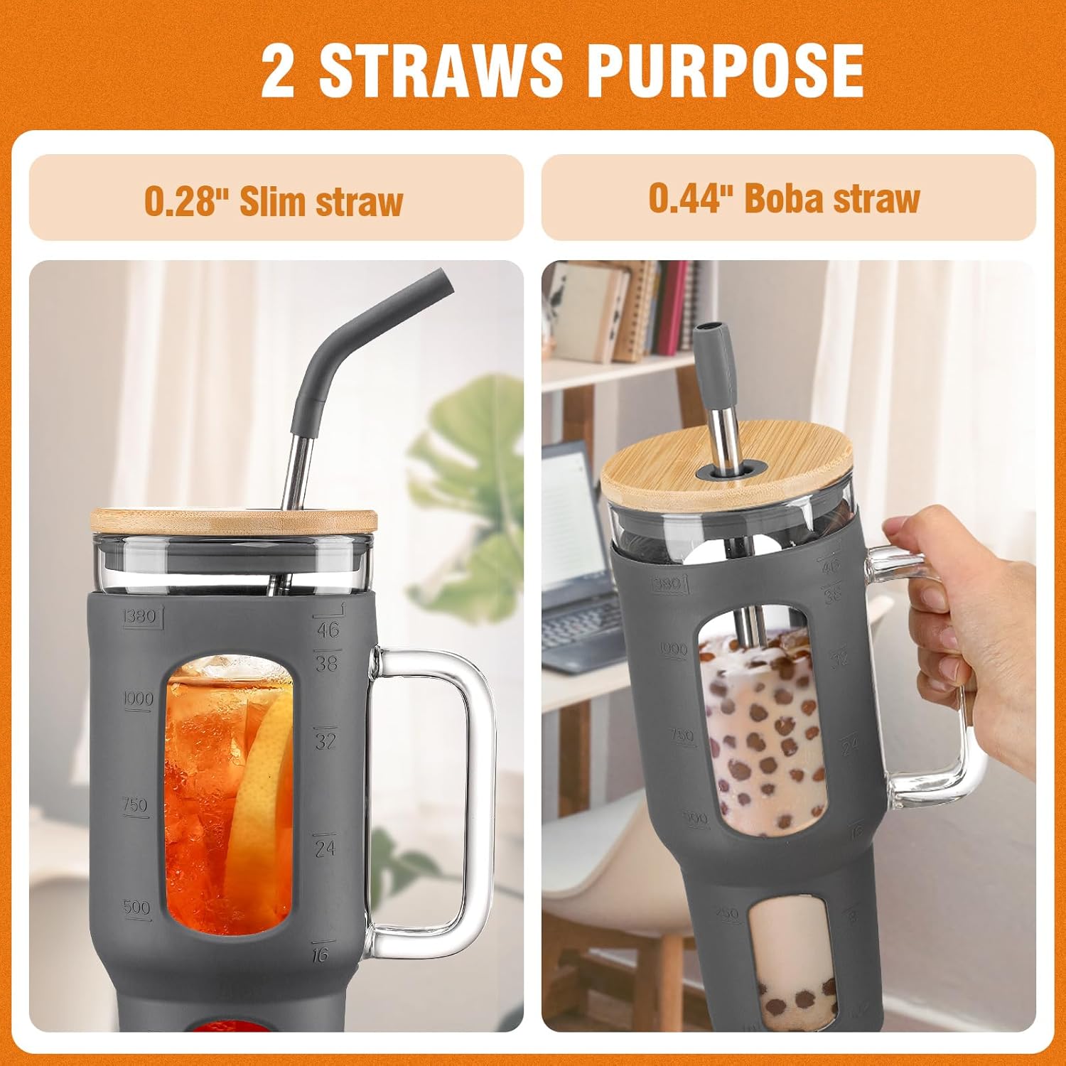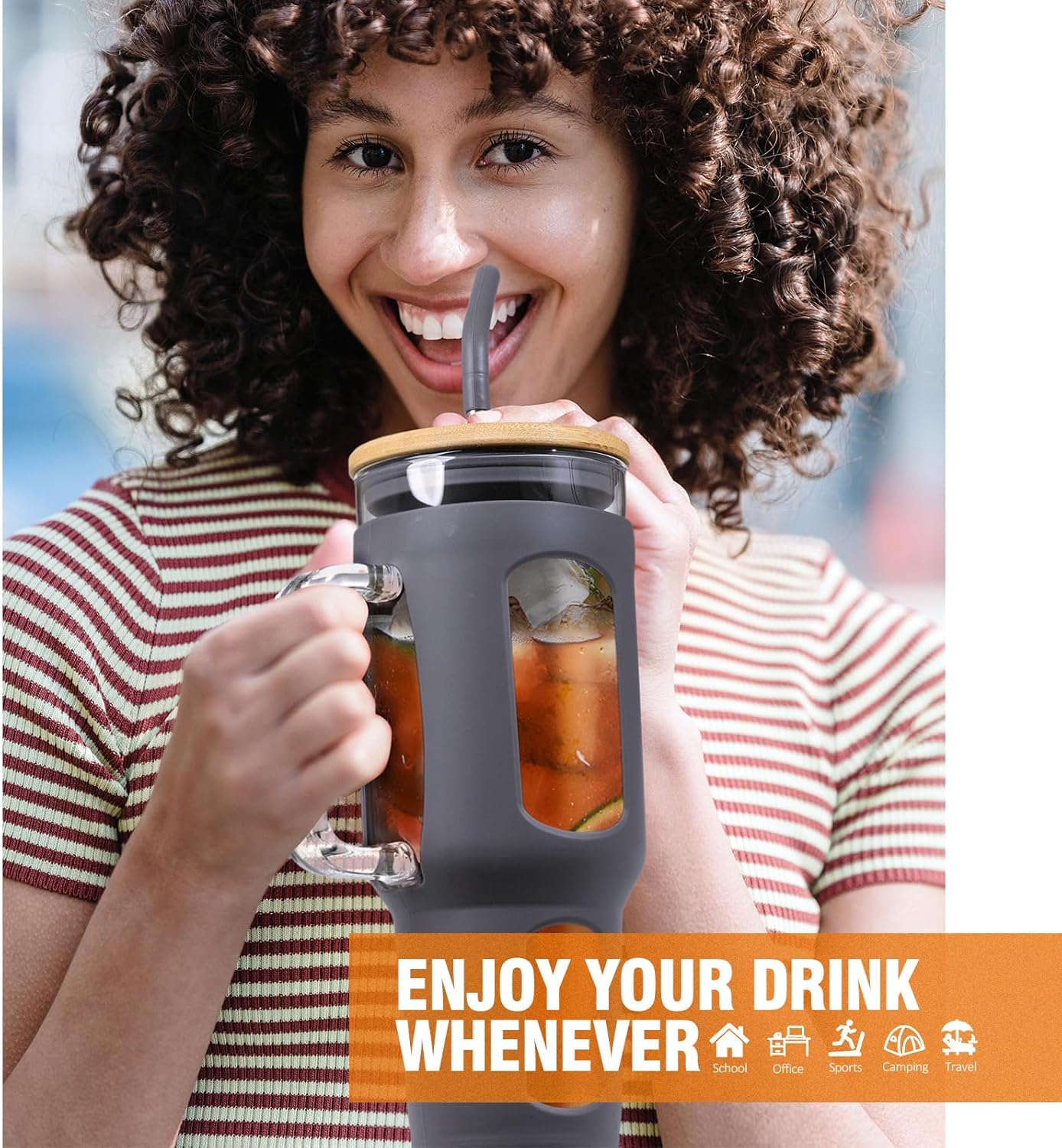 Glass Tumbler with Lid and Straw, 46 oz Iced Coffee Cup with Handle, Large Water Bottles with Silicone Sleeve, Glass Cup with Straws - Pearl Straw & Drinking Straw BPA Free-Grey