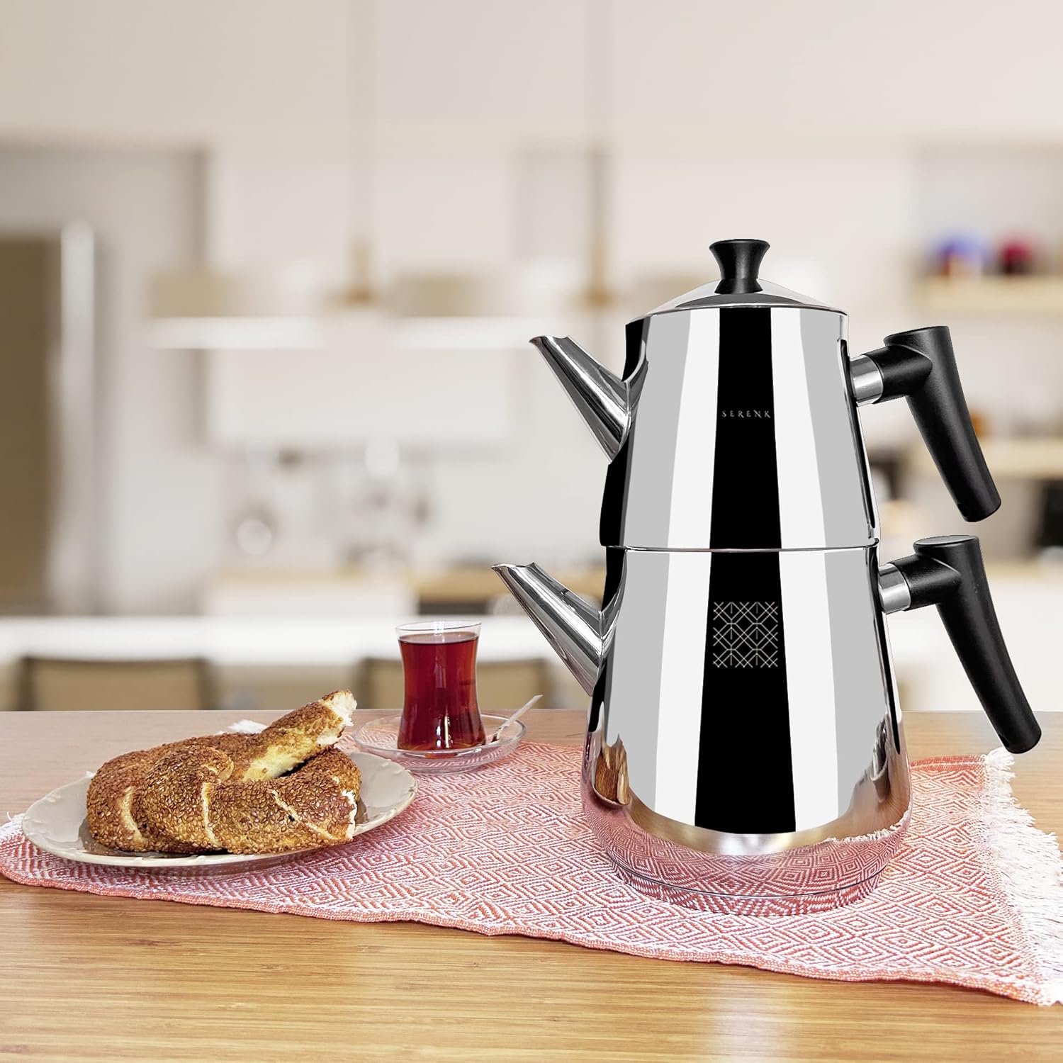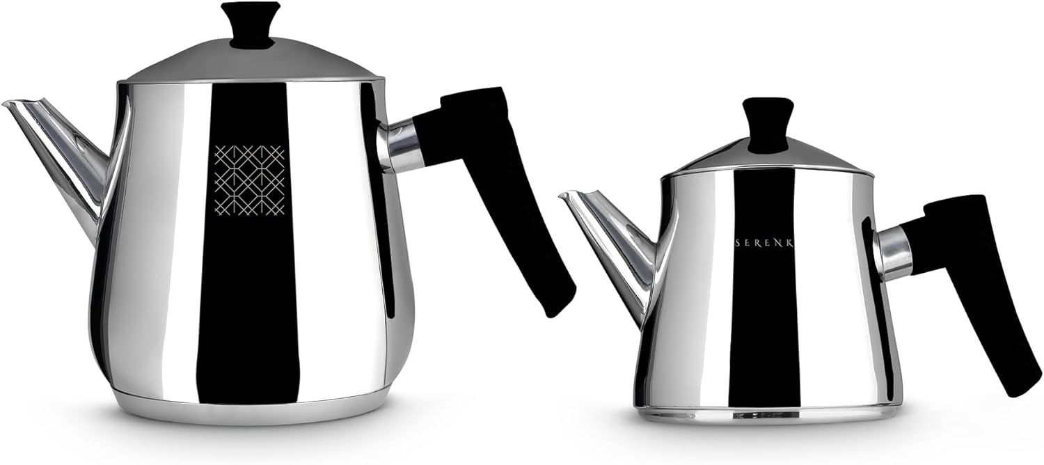 Serenk Stainless Steel Turkish Teapot Set, Double Kettle Set with Non-Slip Bakelite Handles, 101 Oz Black