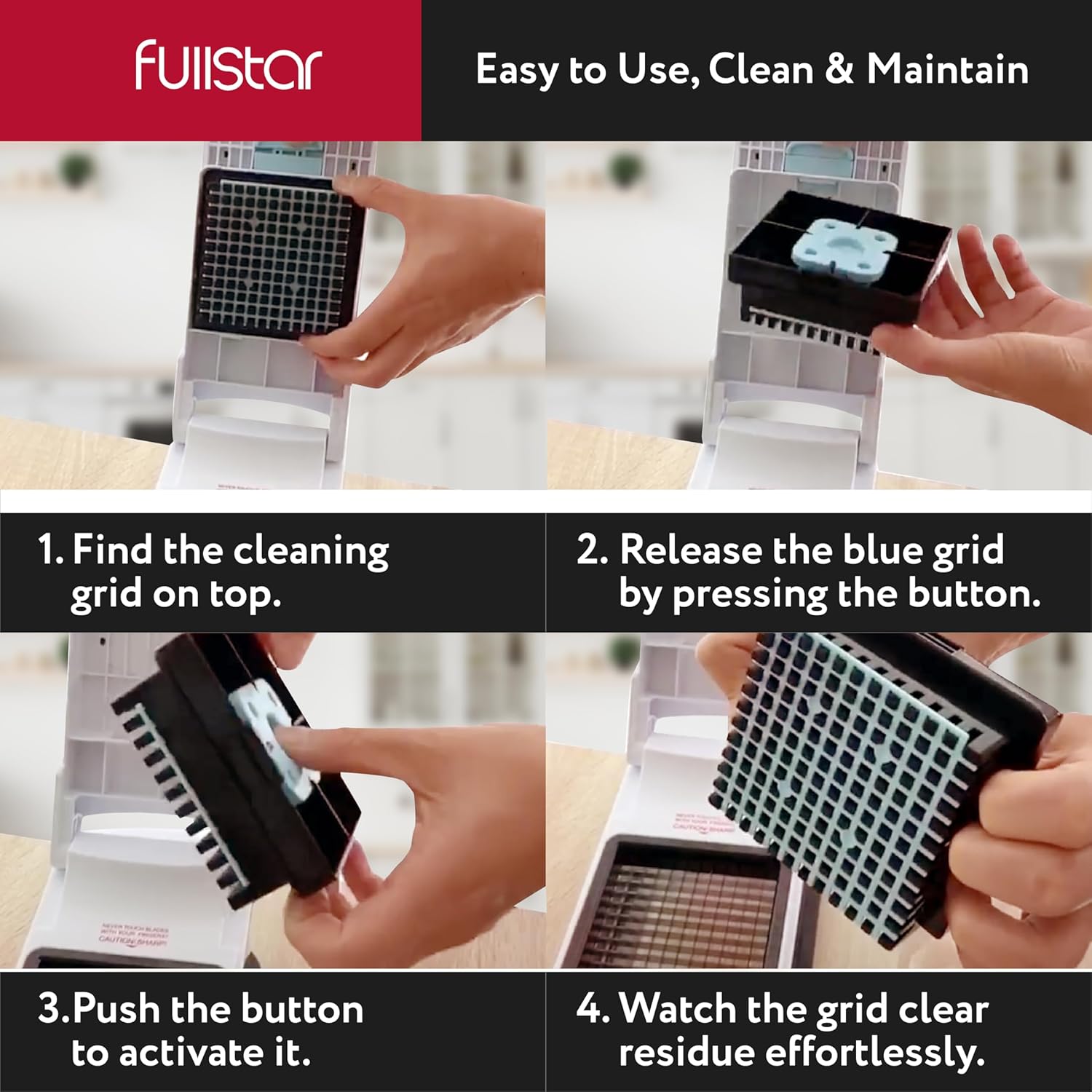 - Effortless Self Cleaning Feature - Our new feature makes cleaning a breeze - just push the release button, then the push button, and watch 99% of food residue disappear. Enjoy a hassle-free kitchen cleanup with our Fullstar chopper vegetable cutter!