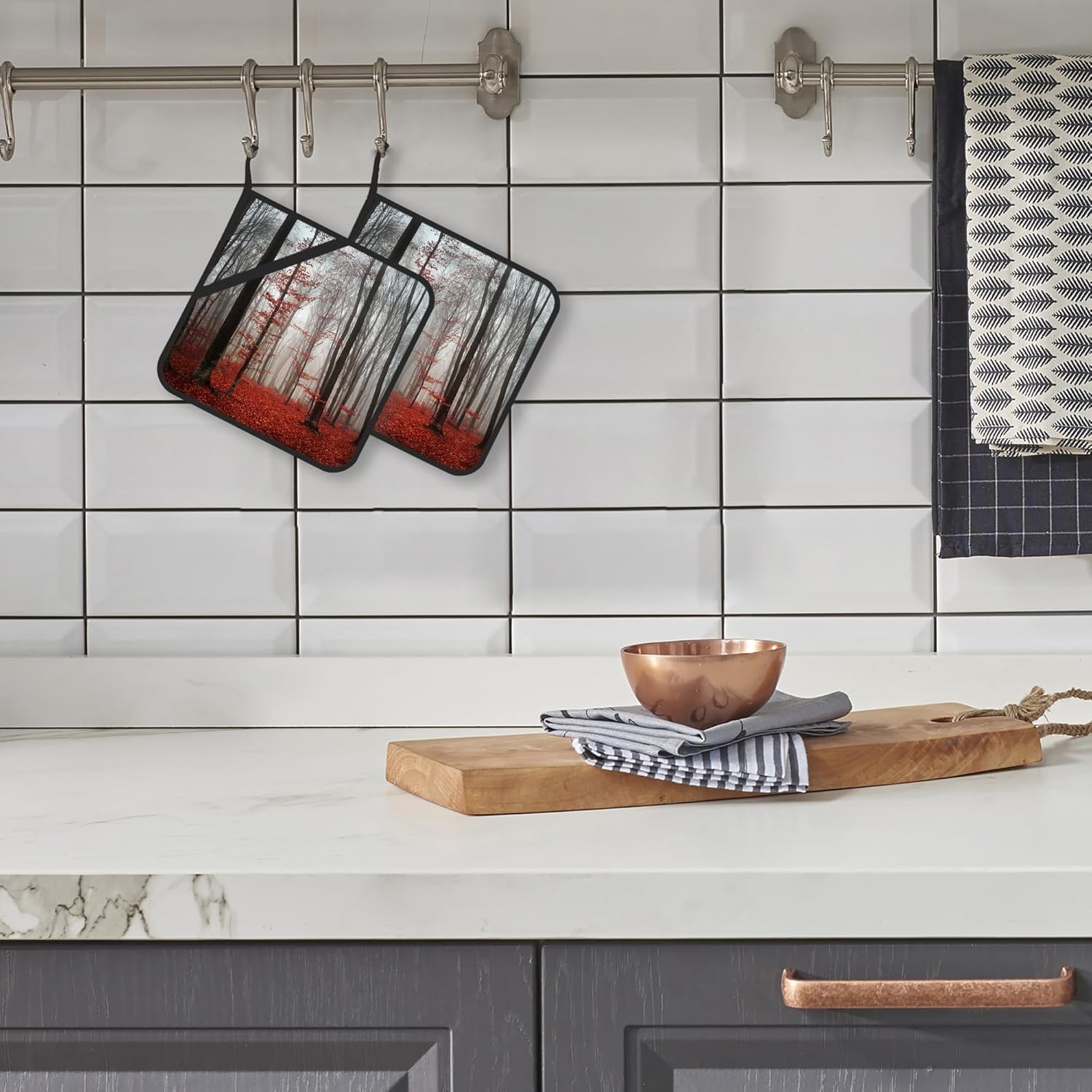 Pot Holder Set of 2,Misty Forest Red Kitchen Heat Resistant Potholder for BBQ Cooking Baking,Food Hot Pat for Women Men Kitchen Wear