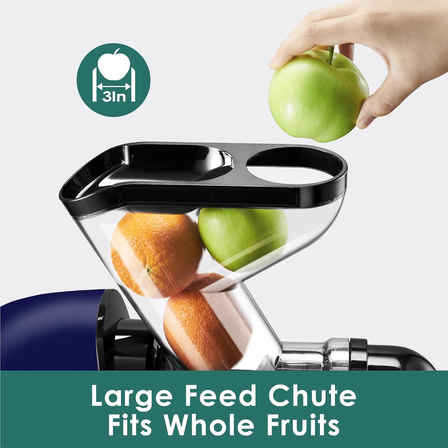 - ăExtra-Wide Feed ChuteăThe Fretta F3000 Edge Max slow masticating juicer is equipped with 3-inch wide feed chute, making it easy to juice large pieces of fruits and vegetables without the hassle of tedious cutting.By minimizing chopping, the juice will be less oxidized, preserving its nutritional content. Tips: This juicer does not automatically remove fruit peels. The image is only for demonstrating the size of the feeding chute. Therefore, for better taste, it is recommended to remove the peels before jucing.