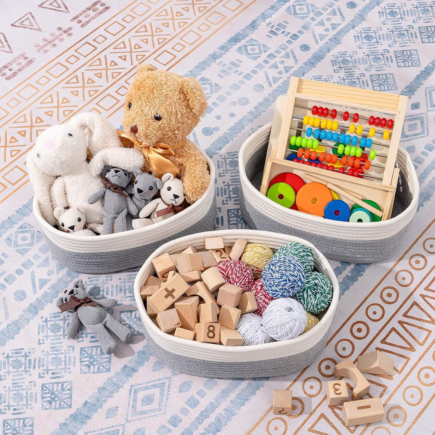 - Classy Natural Cotton Rope Storage Baskets-High quality well made. Very sturdy and a cute modern style. Durable woven rope, Long-lasting, skin-friendly, soft and attractive. You need these adorable baskets to put some supplies in, diaper, jewelry, cosmetics, makeup brushes, tea bags, storing smaller toys, toddler socks, candy