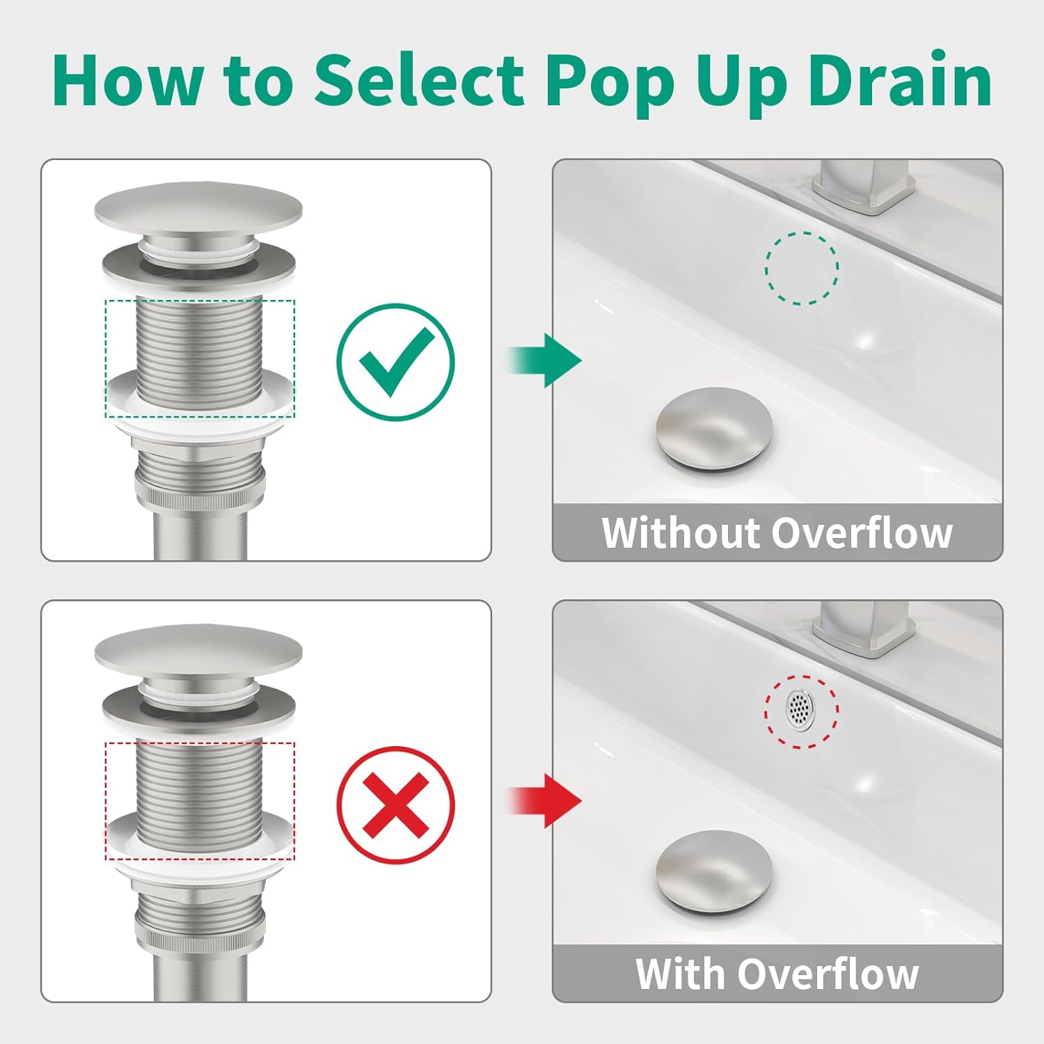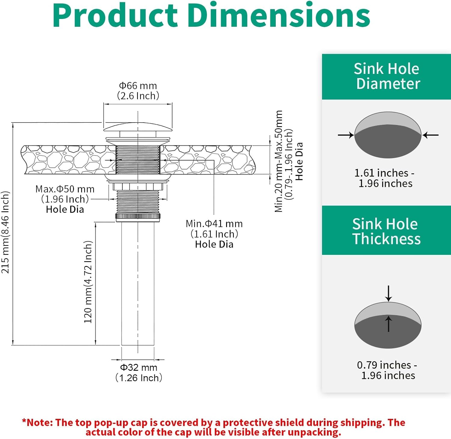 - 【Standard Size Drain】: This bathroom sink drain is suitable for the sink without overflow. Please confirm whether it matches the sink in your home before purchasing. Suitable for sink hole with diameter of 1.61 inches to 1.96 inches and fits drain pipe with a diameter of 1.25 inches or 1.5 inches. And the maximum thickness of basin is 1.96 inches. Most bathroom sinks and standard size water pipes can match our drain.