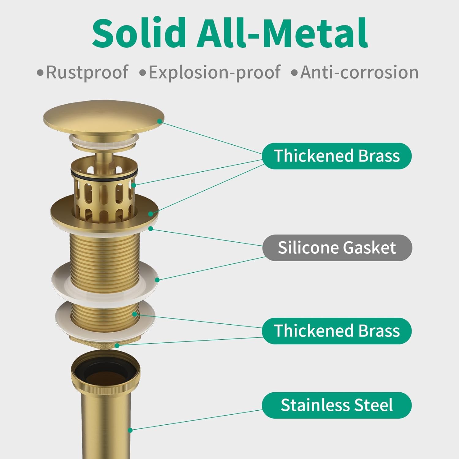 - 【Leak-proof Design】: This push button sink drain is equipped with two thickened silicone gaskets and a brass locking nut, which can ensure a tight fit between the drain and the sink. Moreover, the silicone gasket has the characteristics of resistant to oxidation and wear, which can effectively preventing water leakage and thus keeping the bottom of the sink dry.