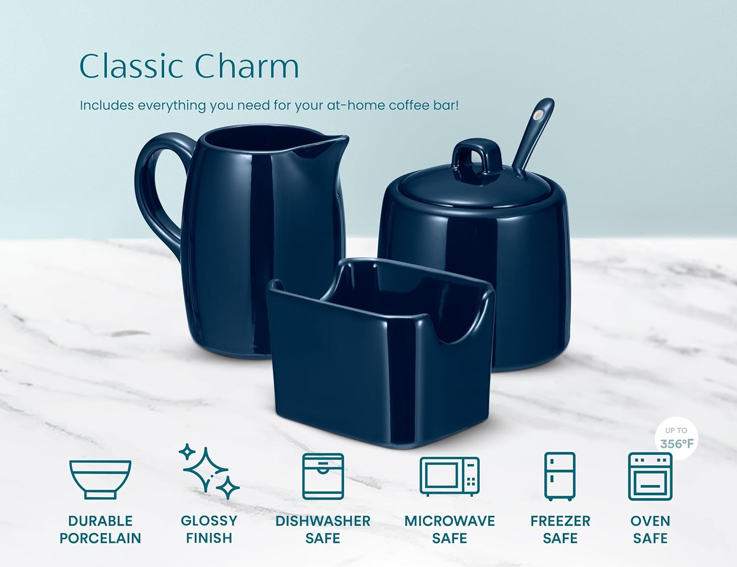 - Classic Charm: Includes everything you need to set up your own home coffee bar! Includes a milk and creamer dispenser, a sugar container with a lid and tiny spoon, and a sweetener packet holder