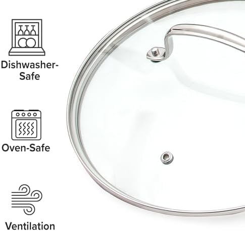 - PREMIUM TEMPERED GLASS LIDS – The premium shatter-resistant lids included with this set include a small ventilation opening to ensure steam is released safely while you’re cooking. Plus, they are oven safe up to 350°F and dishwasher safe.