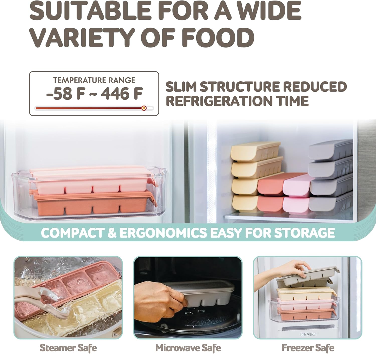 - Slim and Compact Design: These silicone freezer containers are available in 4, 6 or 12 compartments, featuring a stackable, ultra-slim and ergonomic design for easy storage. The ultra-wide area which receives cold air ensures a faster freezing process of the contents!