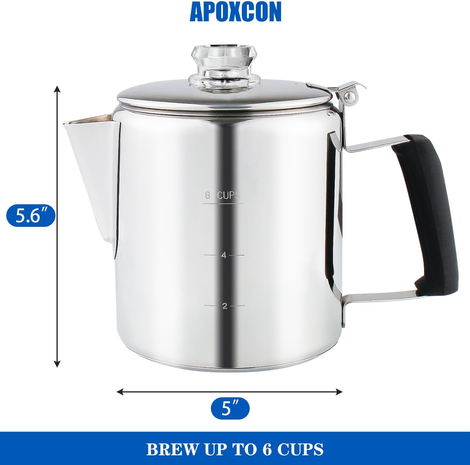 - COMPACT AND PORTABLE --- This camping coffee pot can hold up to 6 cups of coffee. The compact structure makes the coffee pot very easy to carry. Whether camping or enjoying coffee at home, this coffee percolator is always at your service.