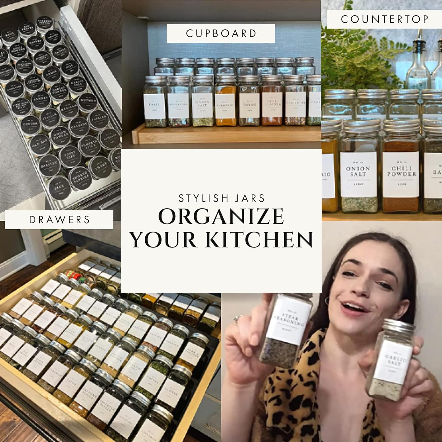 - STURDY AND PANTRY FRIENDLY JARS: Each spice jars with shaker lids is crafted from thick, durable glass, providing ample storage for your spices. These seasoning jars with labels fit seamlessly into any drawer, pantry, or cabinet, maximizing your kitchenโs organization and efficiency