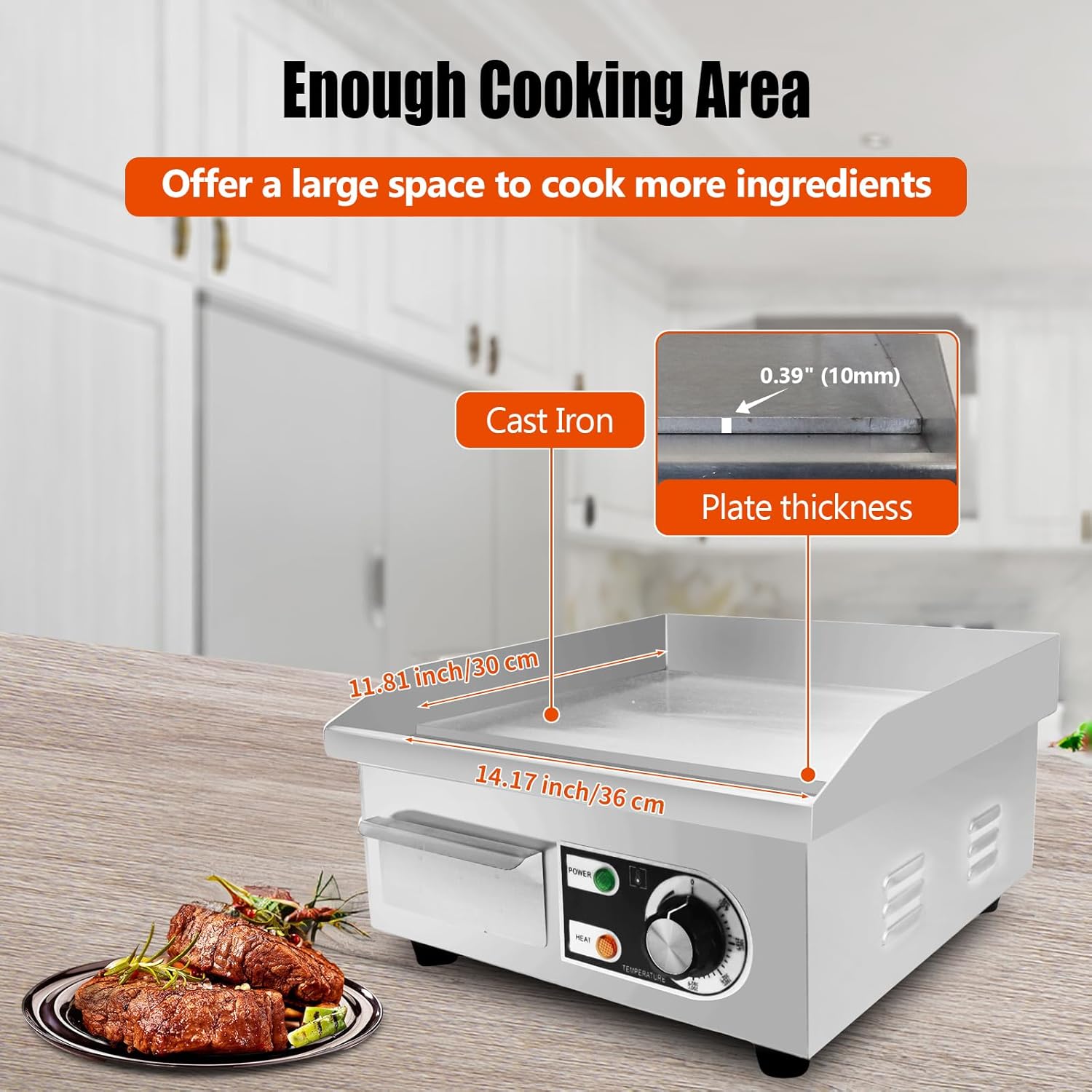 - Thickened baking tray:Commercial electric griddle cooking surface is 14.2 inch x 11.8 inch, the Thickened griddle provide a spacious room for you to cook,The thickness of its grill plate is 0.39" (10 mm),which is not easy to deform and durable to use.