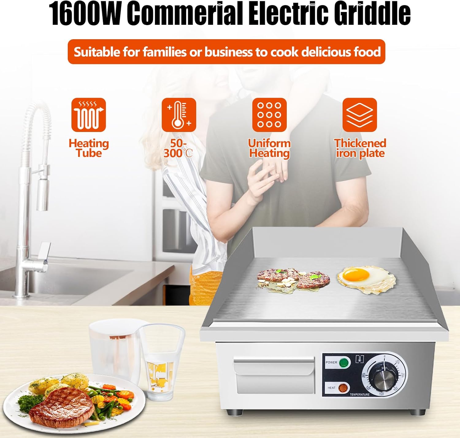 - Food grade stainless steel material:The commercial griddle be made of food grade stainless steel,and the grill plate adopts cast iron material, the grill plate adopts cast iron material, which is high quality, compact and sturdy. Non-stick grill plate, easy to cook and clean.The button can rotate 360 degrees and roast them evenly.