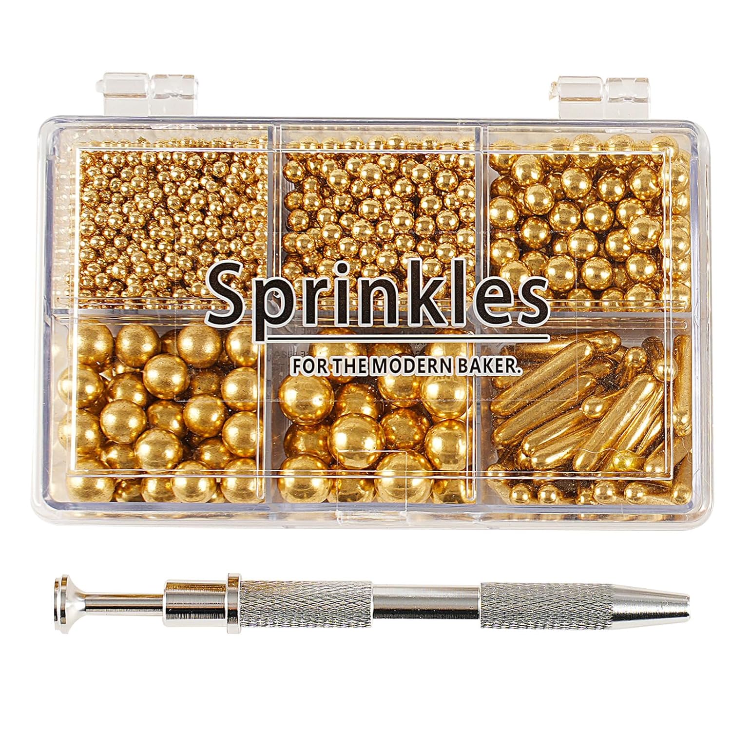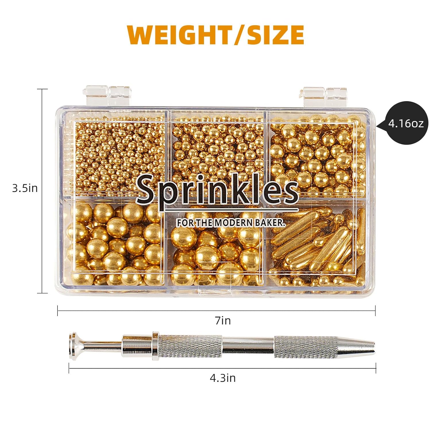 Kasvan Gold Mix Sugar Sprinkles - Edible Candy Pearls with 4-Claw Sprinkle Pen,118g/4.16 Oz, Gift Box Pack, Baking Cake Decorations, Ice Cream Toppings and Cookie Decorating, Wedding Party Chirstmas Supplies