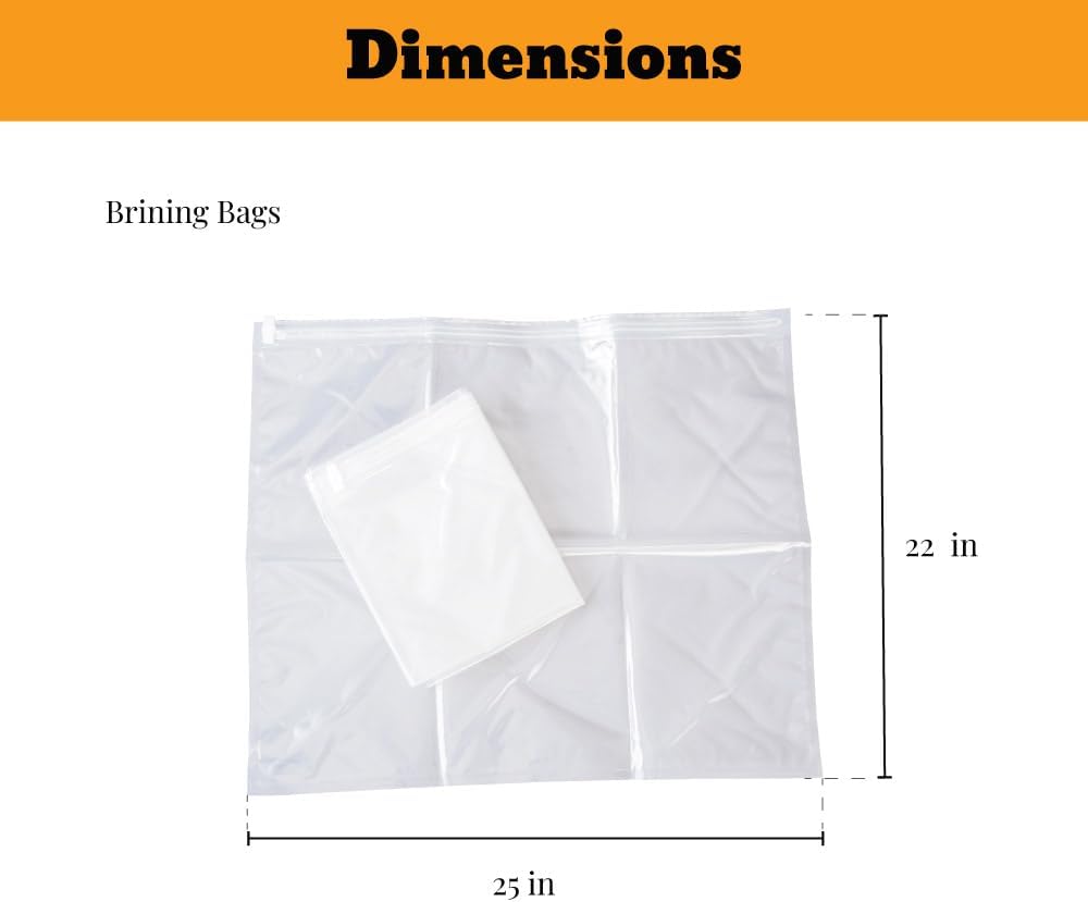 - Toolset: 1) Extra-Large Brining Bags (2-Pack) - These premium brining bags are ideal for enhancing the flavor and moisture content of meats, ensuring they remain juicy and do not dry out. Equipped with durable double-track zippers, measuring 26''x22'', these heavy-duty bags can accommodate up to a 35 lb Thanksgiving turkey or a large ham, making them an essential tool for your holiday cooking.