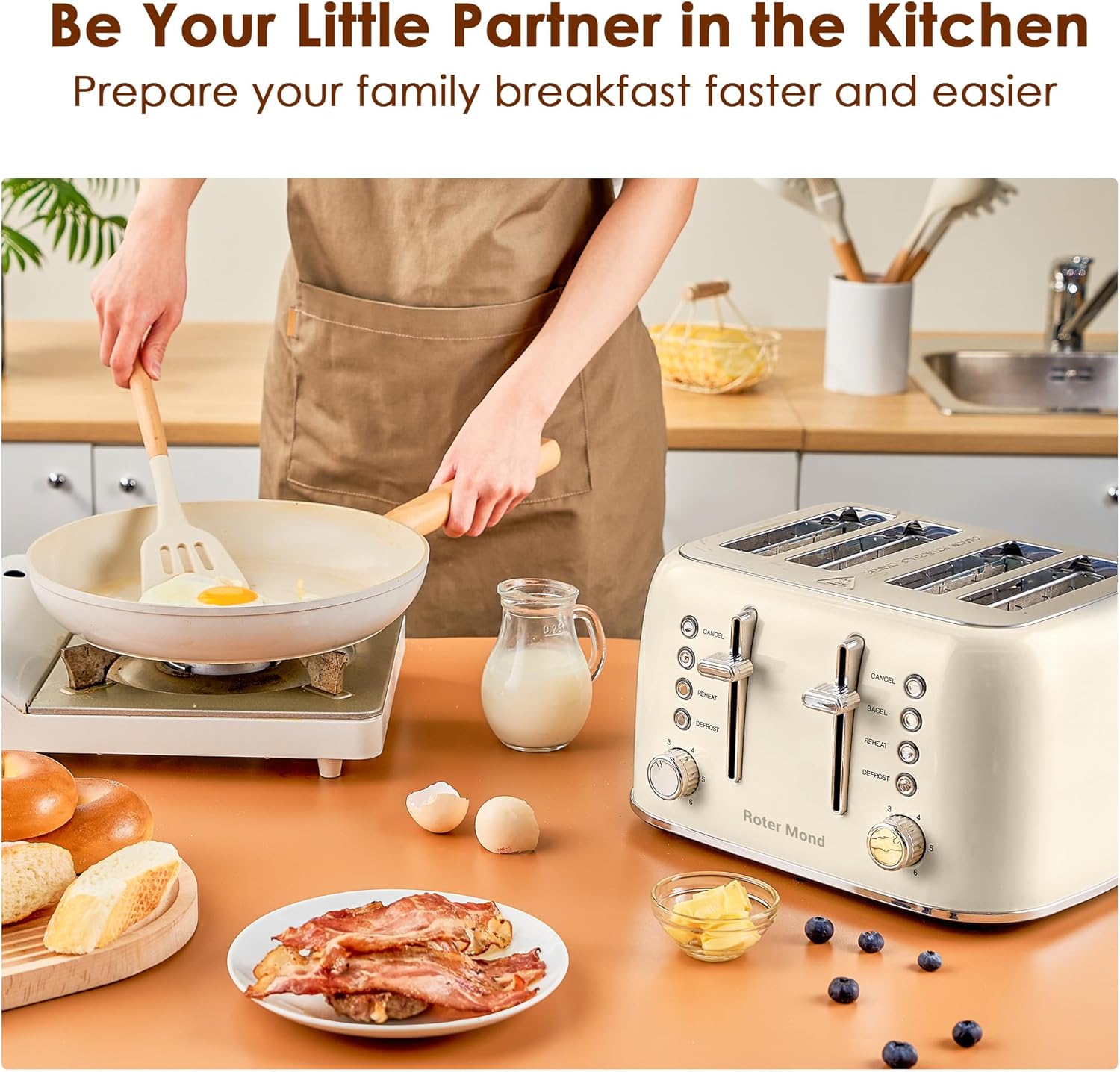 - 1.5 Inch Extra-wide Slots: With size of 5.5 x1.5 inch slots, Roter Mond 4 slice retro toaster can easily handle bagels, English muffins and other thicker or smaller such as sourdough, tortillas and Texas toast. Its stainless steel design can avoid being rusted, and all stains can be easily cleaned with one wipe. Food-grade and BPA free materials could provide better safety for family members while enjoying delicious breakfast