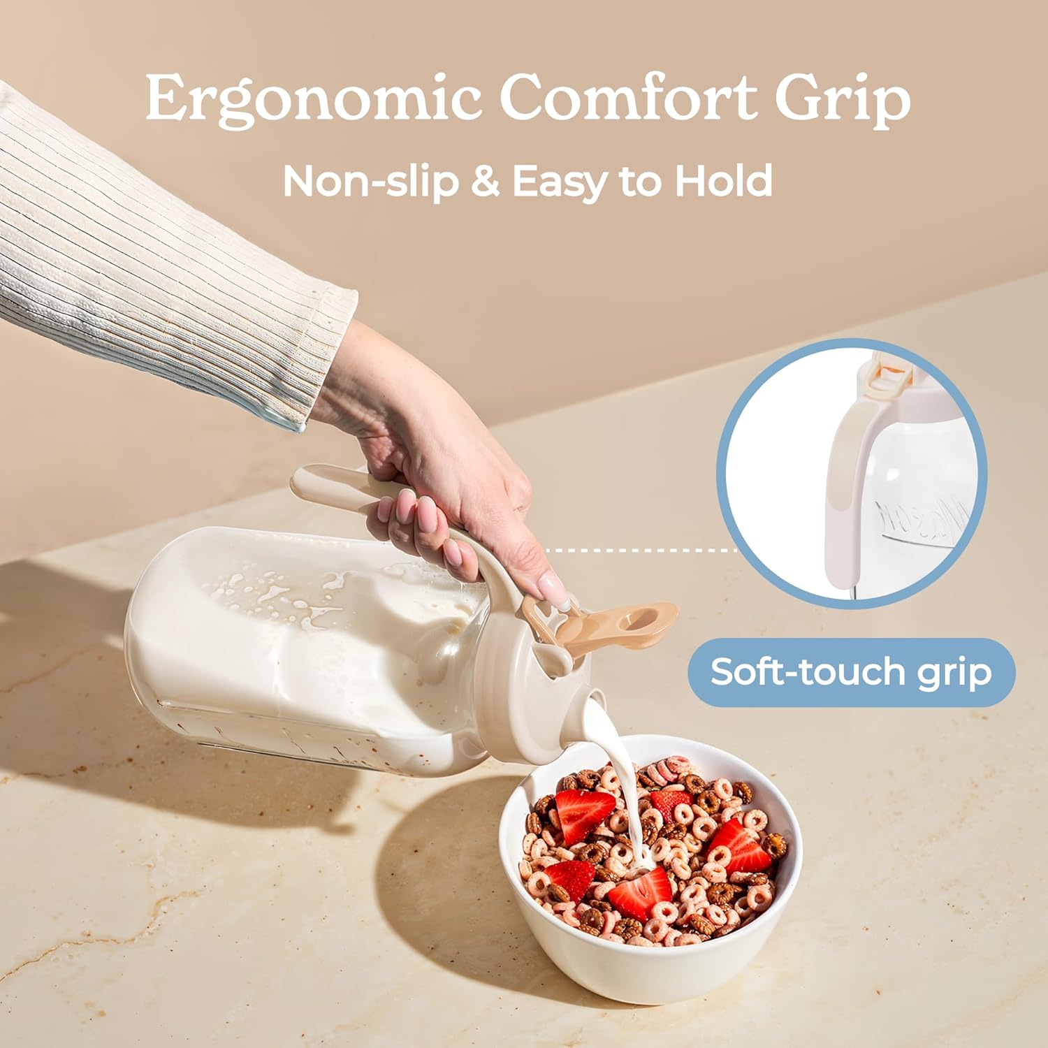 - Functional design: The non-slip handle on this 2 quart pitcher with lid ensures steady pouring.Hanging ring on this large mason jars adds convenience for easy carrying and storage