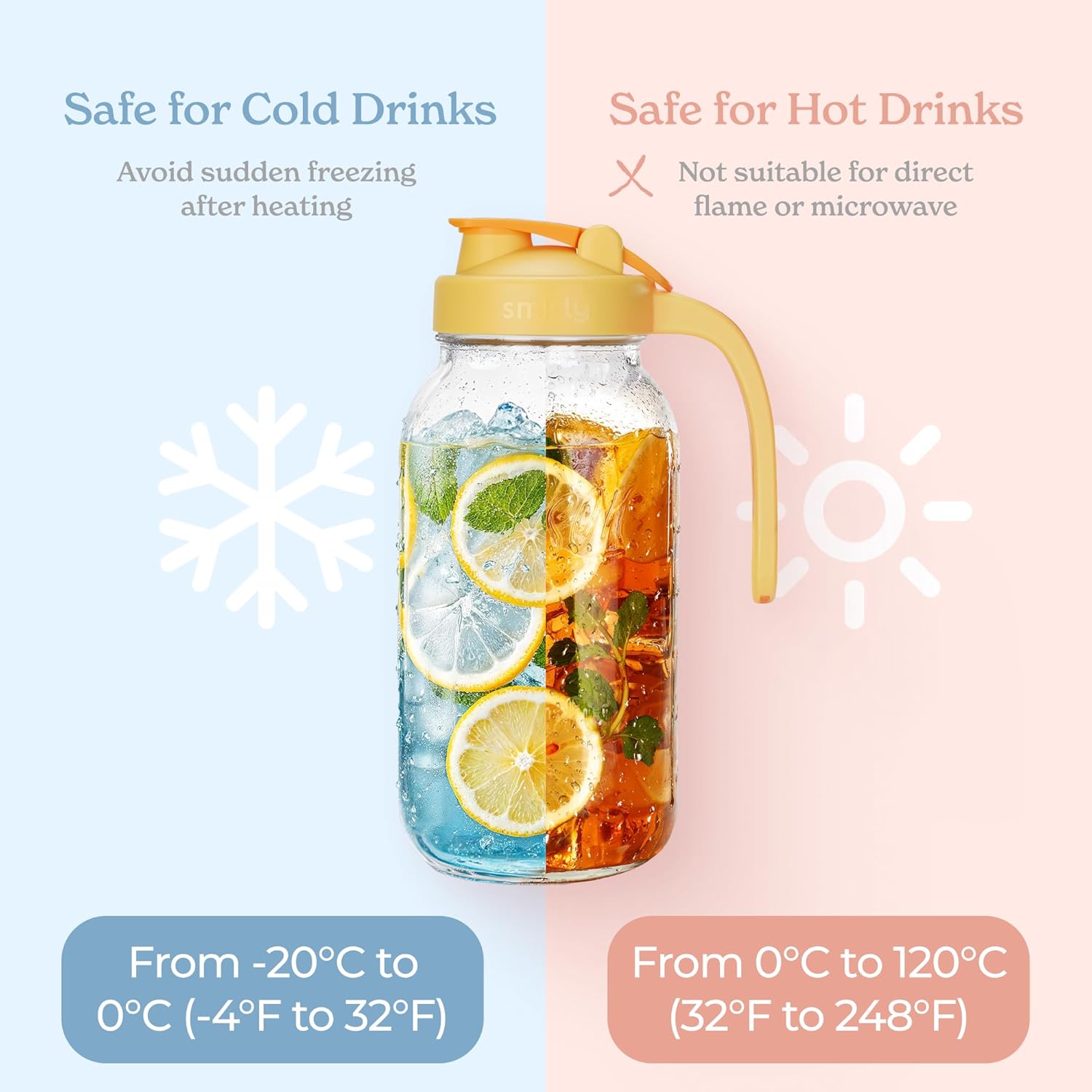 SMIRLY 64 oz Mason Jar Pitcher,Glass Pitcher with Wide Mouth,Water Jug with Double Leak Proof Lid for Iced Coffee,Hot Water,Breast Milk
