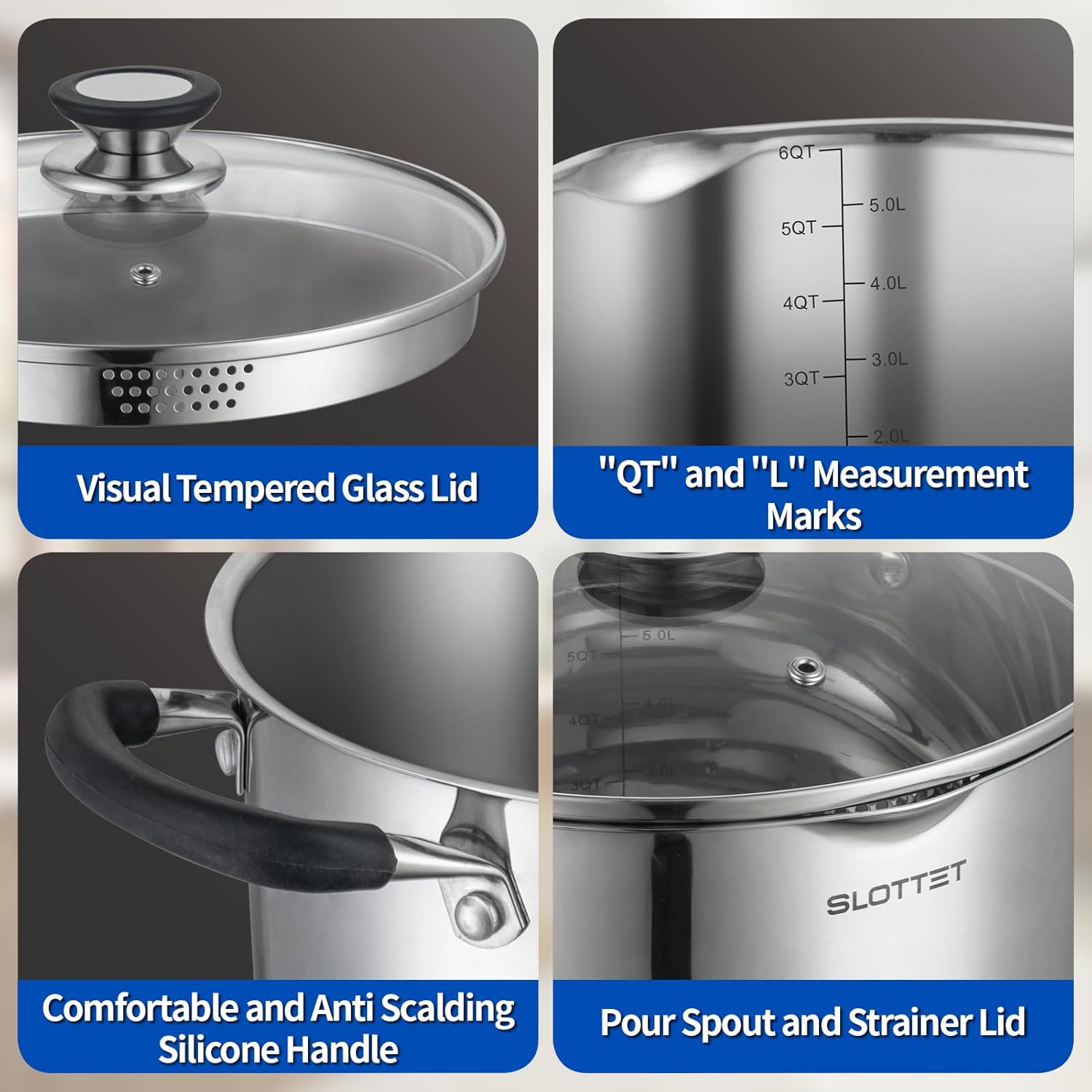 6 Quart Stainless Steel Stock Pot with Strainer Glass Lid,6 Qt Soup Pot Multipurpose Stockpot with Pour Spout,Stay-cool silicone Handle.