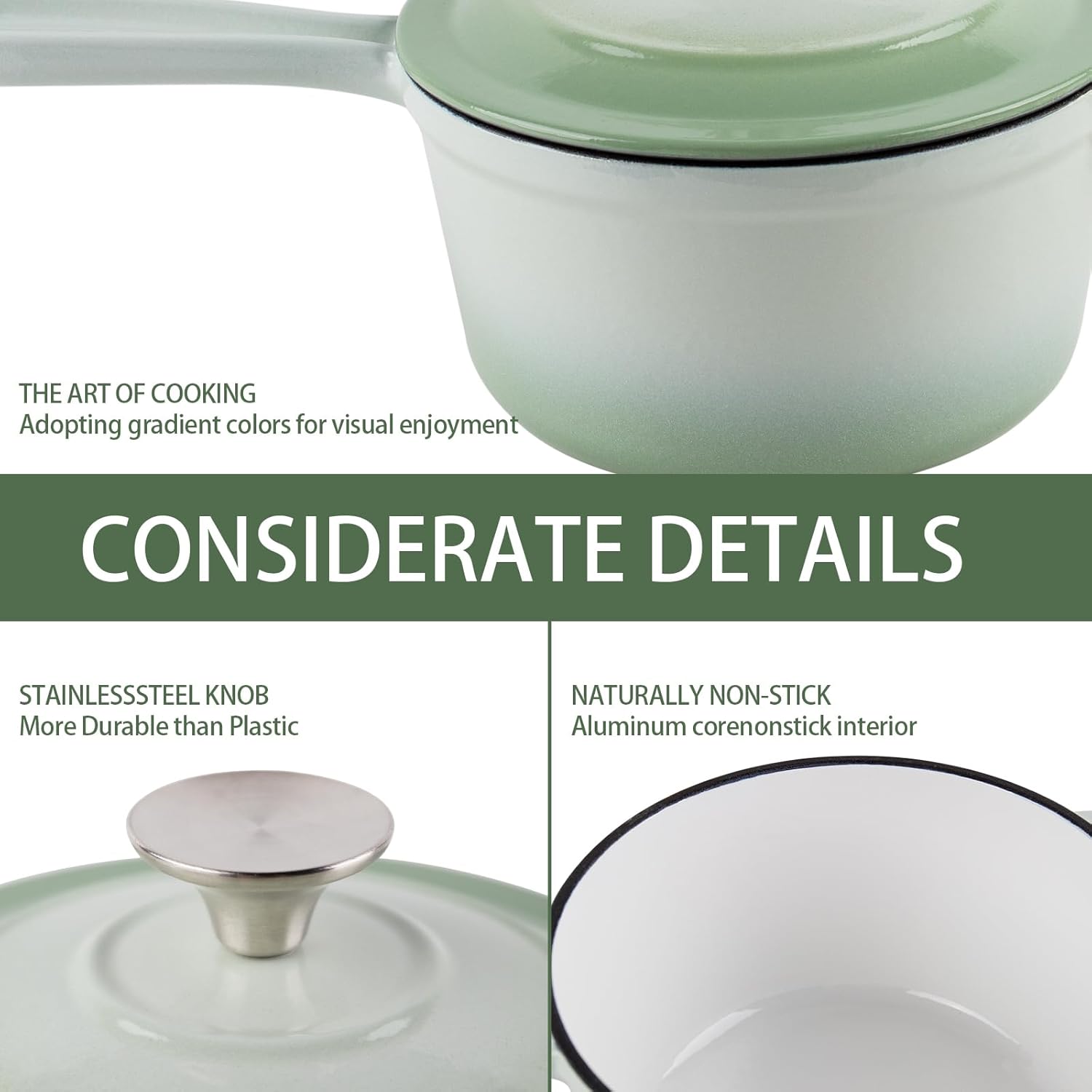 Enameled Cast Iron Sauce Pan, 1.6 Quarts Round Sauce Pot with Lid, Min Dutch Oven Enamel Saucepan for Cooking Pasta Sauce, Gravy, Puddings & Boiling, Gradient Green