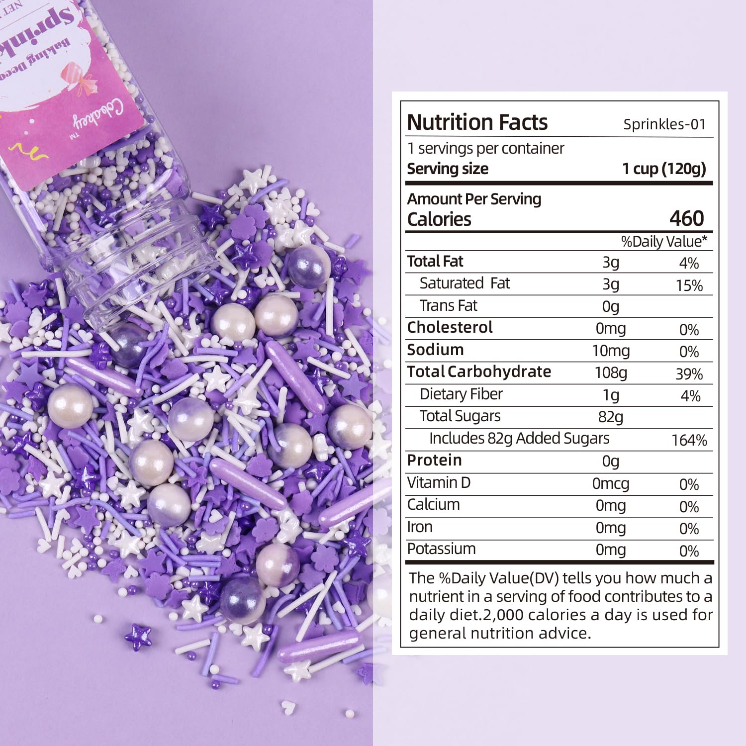 - Pearl Sprinkles: Each bottle weighs 4.23 oz, 120 g. Our Purple sprinkles are made from safe ingredients, Nut Free. Our cake sprinkles are in different shapes of Star and Pearl Sprinkles.