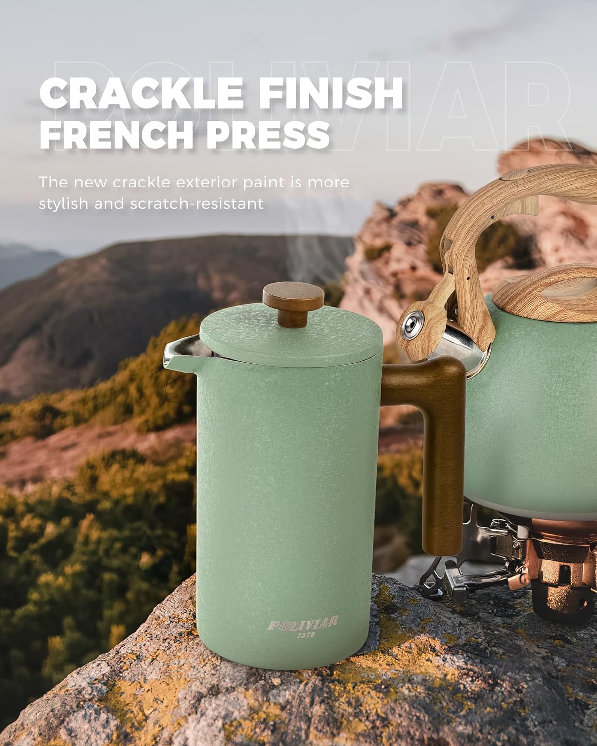 - LOOKING FOR COFFEE PRESS FOR MATCHING UP YOUR KITCHEN? We, the POLIVIAR french press coffee maker will be your smart choice. While the coffee pot is made from food grade stainless steel with stylish long-lasting coating, It is easily to match up your kitchenwares and your kitchen's theme. Also, the ergonomic handle with real wood will maximize the fantastic time of grounds you loved.