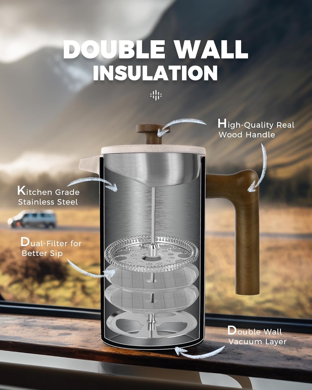 POLIVIAR French Press Coffee Maker, 34 Ounce Coffee Press with Real Wood Handle, Double Wall Insulation & Dual-Filter Screen, Food Grade Stainless Steel for Good Coffee and Tea JX2023-FPLM