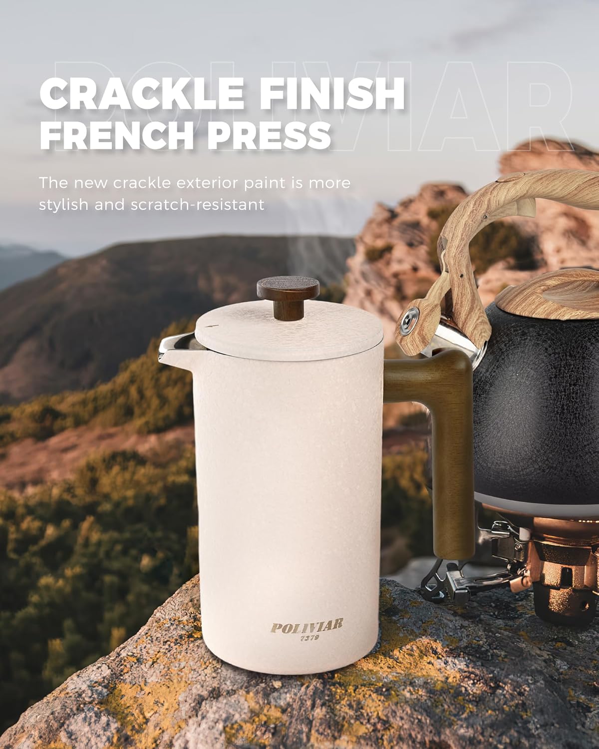- LOOKING FOR COFFEE PRESS FOR MATCHING UP YOUR KITCHEN? We, the POLIVIAR french press coffee maker will be your smart choice. While the coffee pot is made from food grade stainless steel with stylish long-lasting coating, It is easily to match up your kitchenwares and your kitchen's theme. Also, the ergonomic handle with real wood will maximize the fantastic time of grounds you loved.