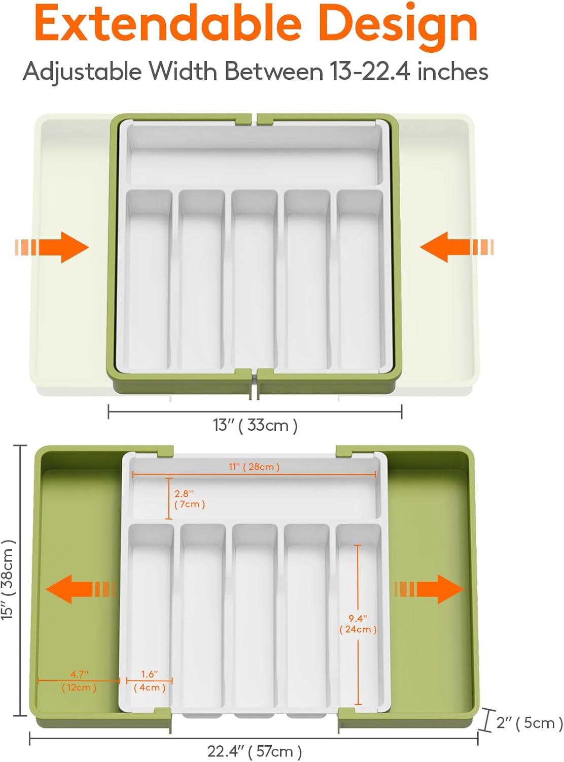 - Adjustable Size: With an adjustable width between 13 and 22.4 inches, it is compatible with different drawer sizes. When fully expanded, the cutlery box dimensions are 22.4 x 15 x 2 inches and when fully folded, it reduces to 13 x 15 x 2 inches. So no matter what size your kitchen drawers are, this utensil organizer will surely fit in.