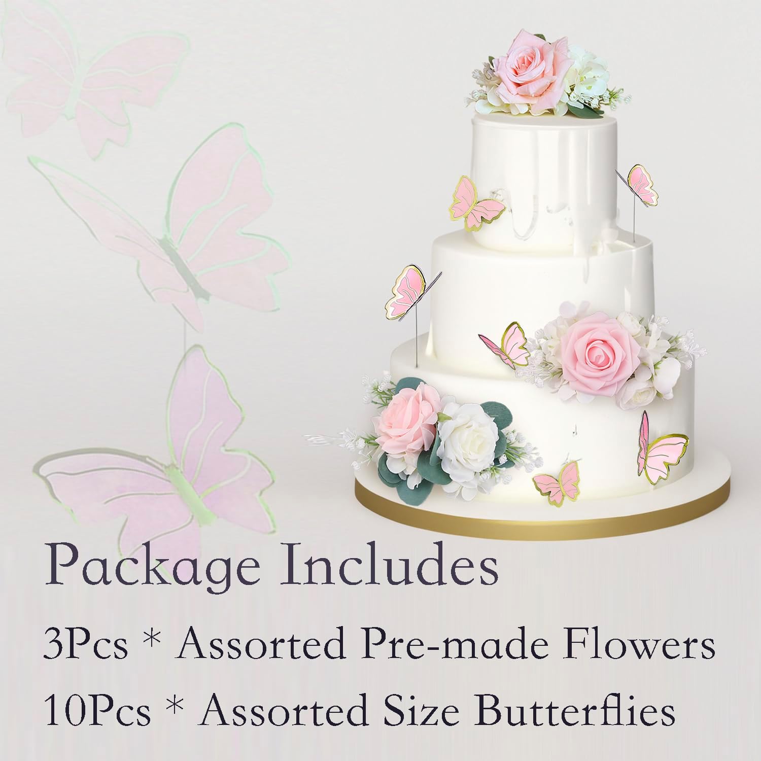 - Complete Set of 13: 3pcs * Assorted Pre-Made Flower Arrangements for Cake. 10pcs * Assorted Size Pink Butterflies
