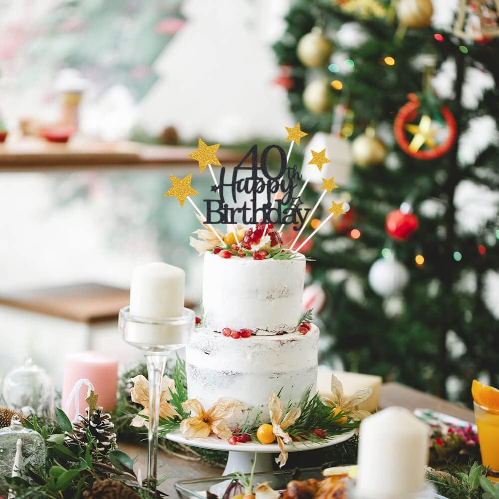 Glittery 40th Happy Birthday Cake Topper with Star,Personalised 40 Birthday Cake Toppers Party Decorations Party Supplies for Men Women Black Gold