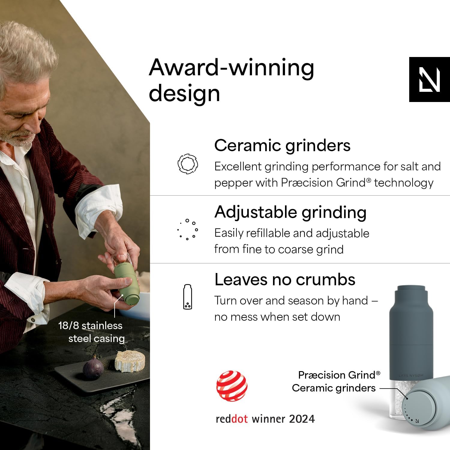 - DESIGN SPICE MILL SET (2 pieces): Our Salt and Pepper Mill Set "Omvendt" impresses with functionality and design. Perfect for everything that adds spice to life - such as pepper or salt.