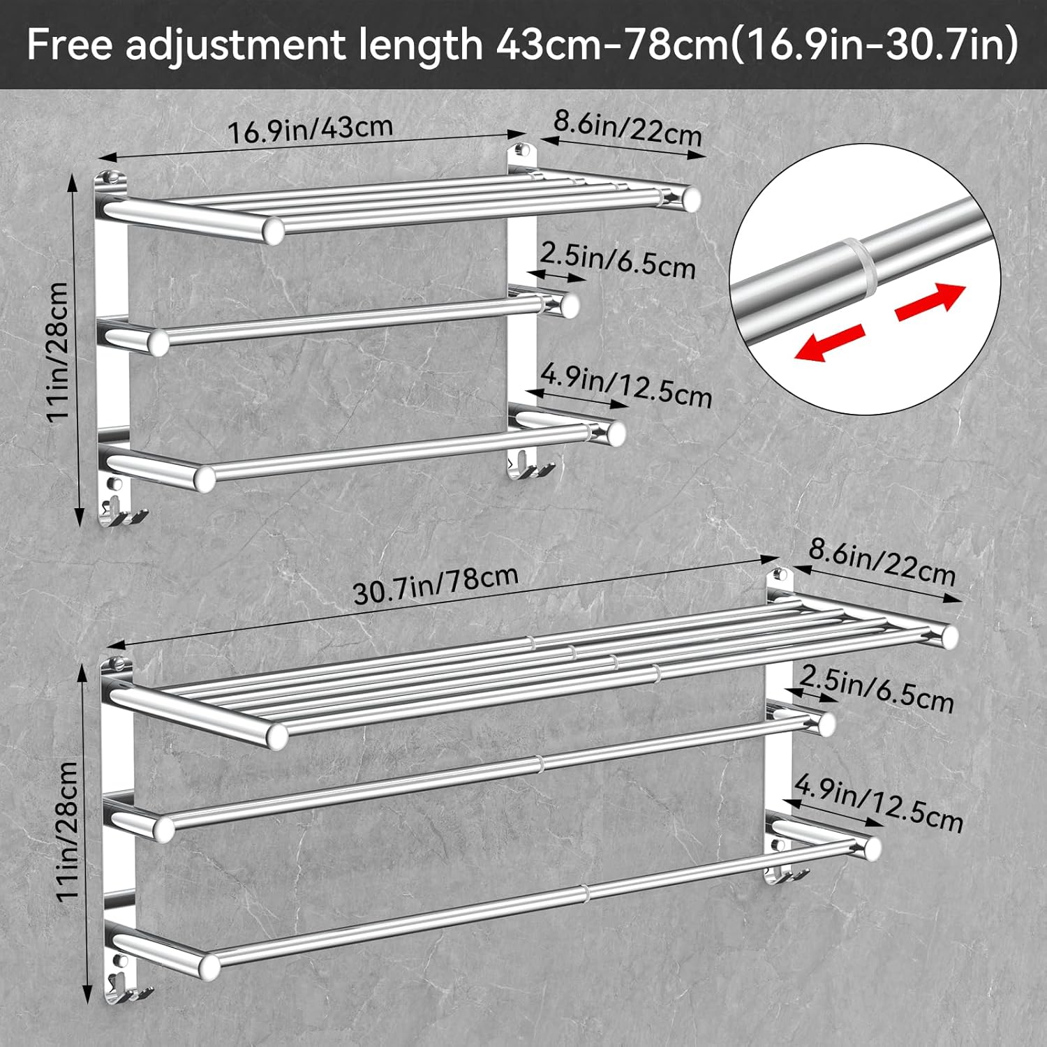 - 【 Scalable Design 】: The towel rack can be freely adjusted in length from 17 inches to 30.7 inches【43-78CM】, which can be adjusted as needed in limited space to improve space utilization.
