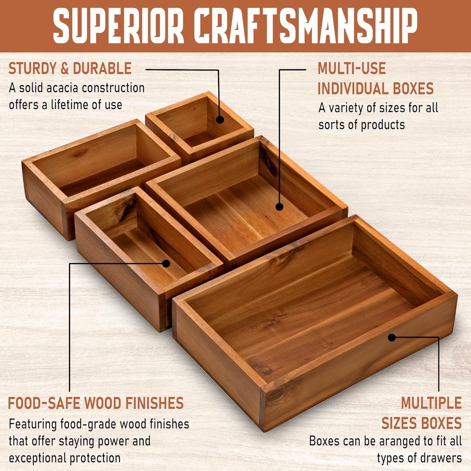 Demigo Acacia Drawer Organizer Set of 5, Cabinet Container Box, Wood Bin Set in Varied Sizes, Dividers Holder for Storage Cooking Utensils Spices Tea Bags Foods Office Items (Brown)