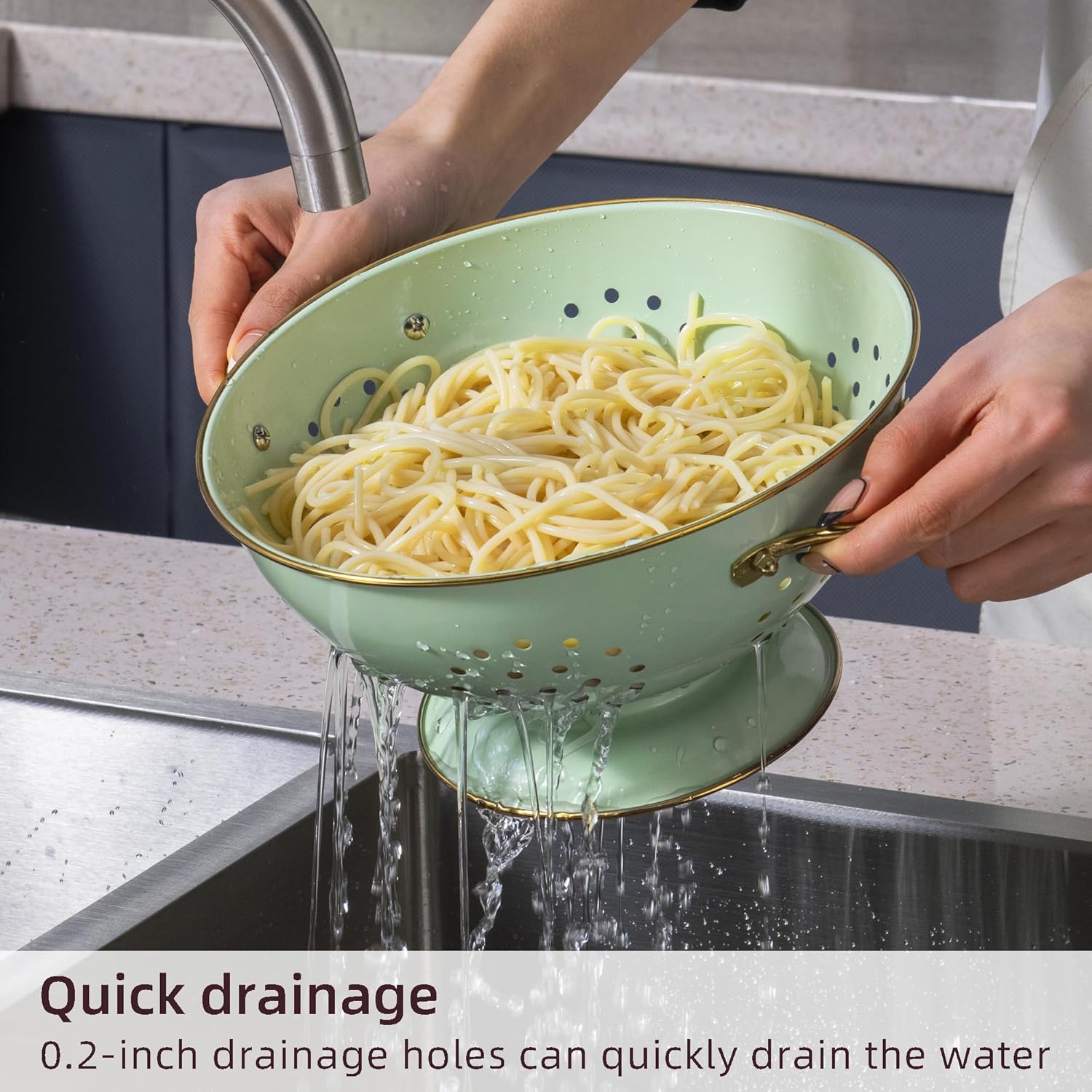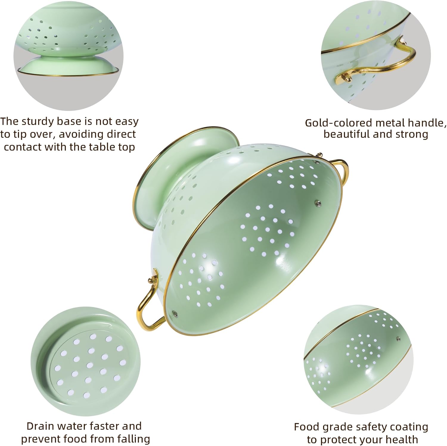 - ăGood Quality Materială: Colander is made of durable metal, with food-safe powder coated, even after long time using, it wont be rusted.